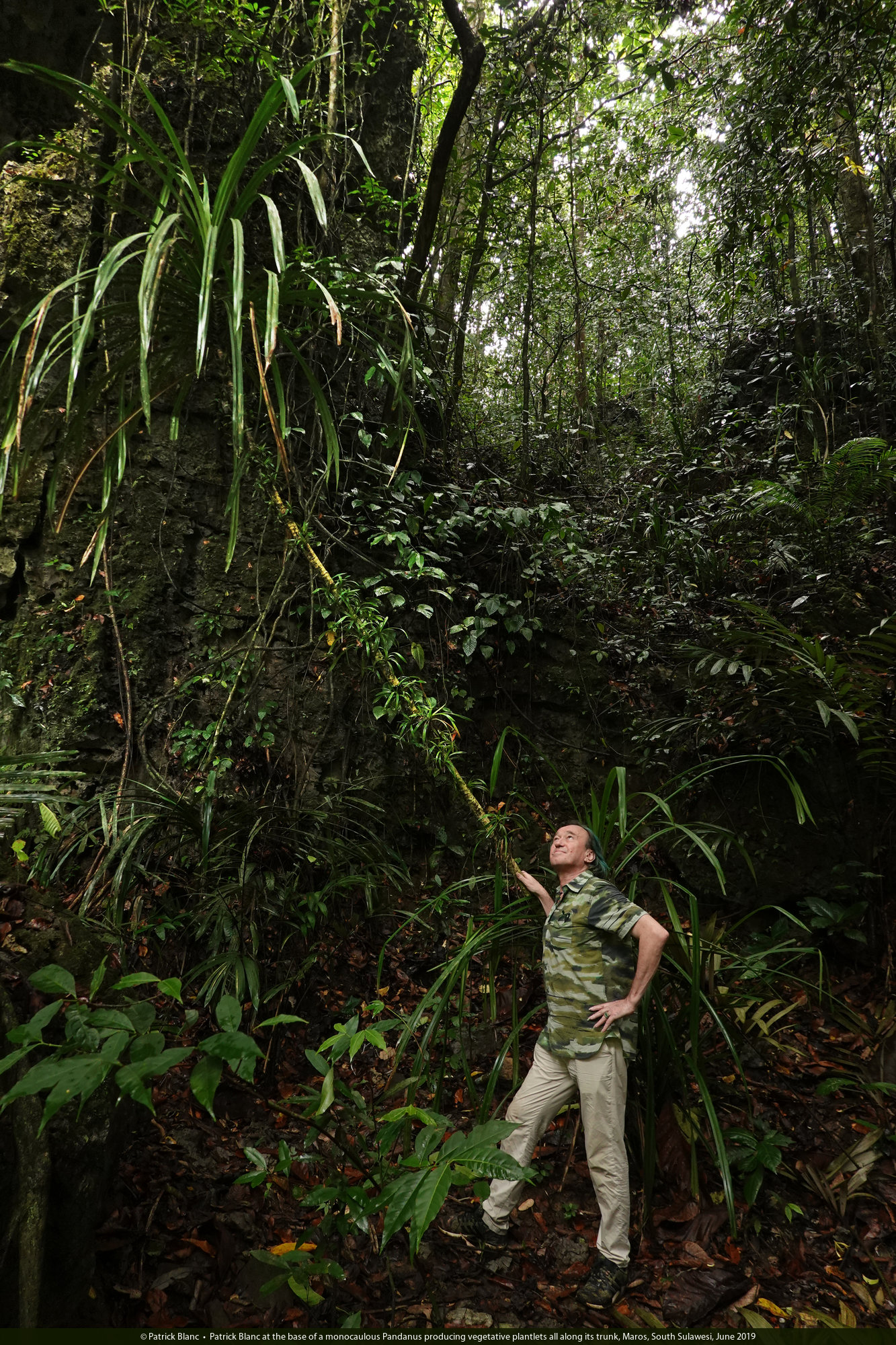 Patrick Blanc at the base of a monocaulous Pandanus producing vegetative plantlets all along its trunk, Maros, South Sulawesi, June 2019