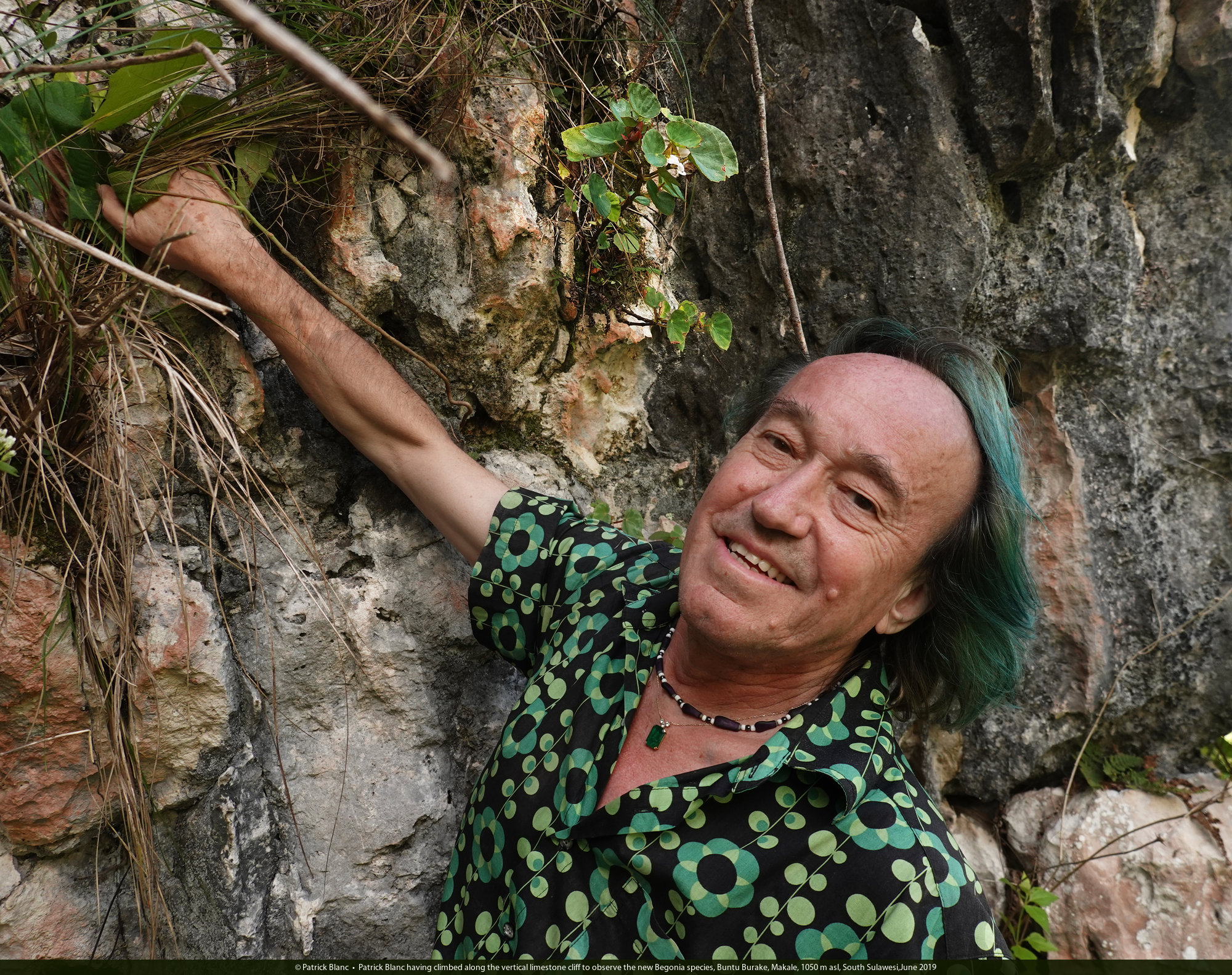Patrick Blanc at the base of a vertical limestone earth bank, observing the much branched inflorescence of Begonia popenoei, an escaped Central American species, Buntu Burake, Tana Toraja, South Sulawesi, June 2019