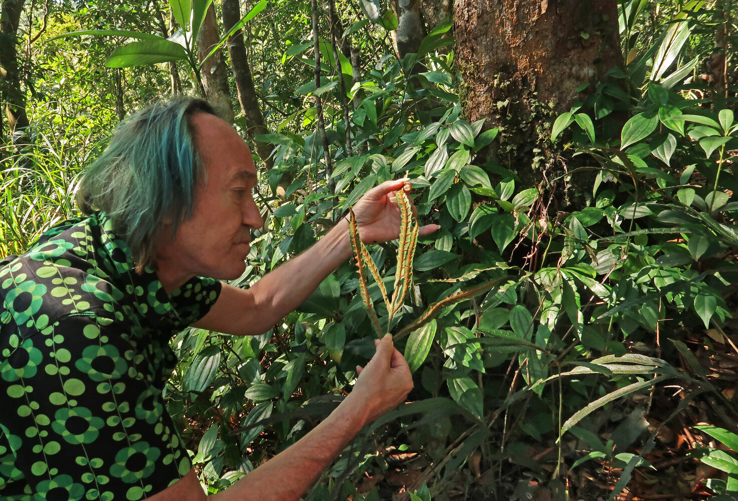 Patrick Blanc observing the leaves of of Aspidistra sutepensis, Doi Suthep NP, Thailand, Nov. 2018