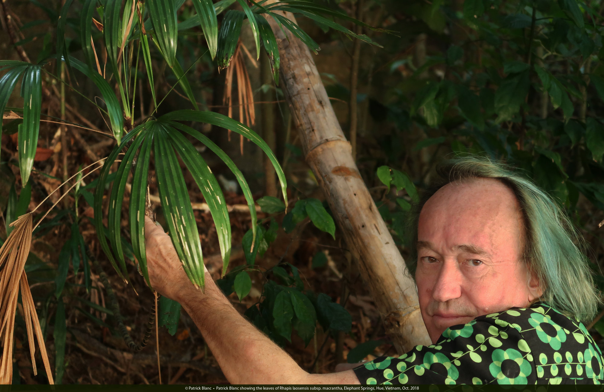 Patrick Blanc showing the leaves of Rhapis laosensis subsp. macrantha, Elephant Springs, Hue, Vietnam, Oct. 2018