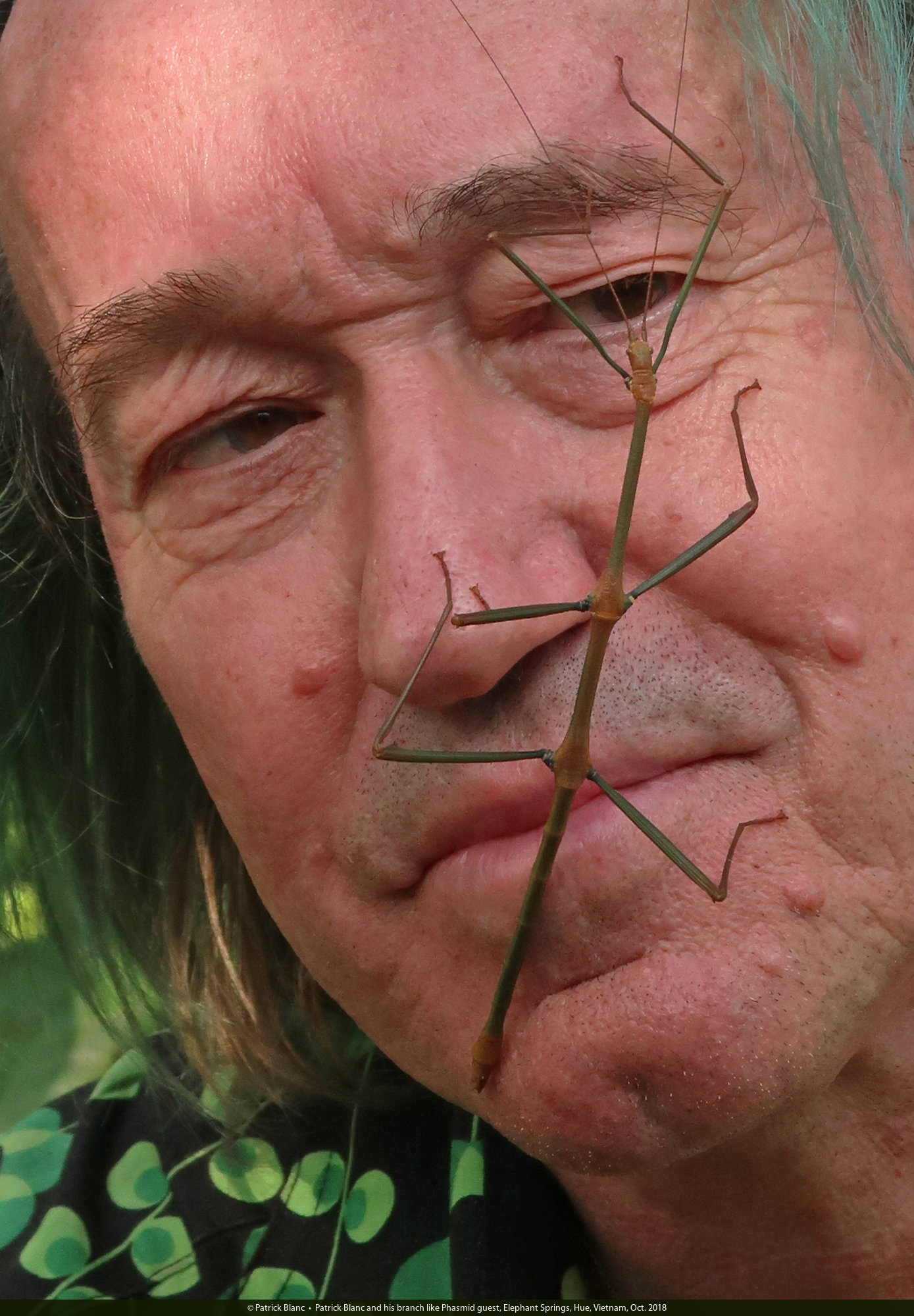 Patrick Blanc and his branch like Phasmid guest, Elephant Springs, Hue, Vietnam, Oct. 2018