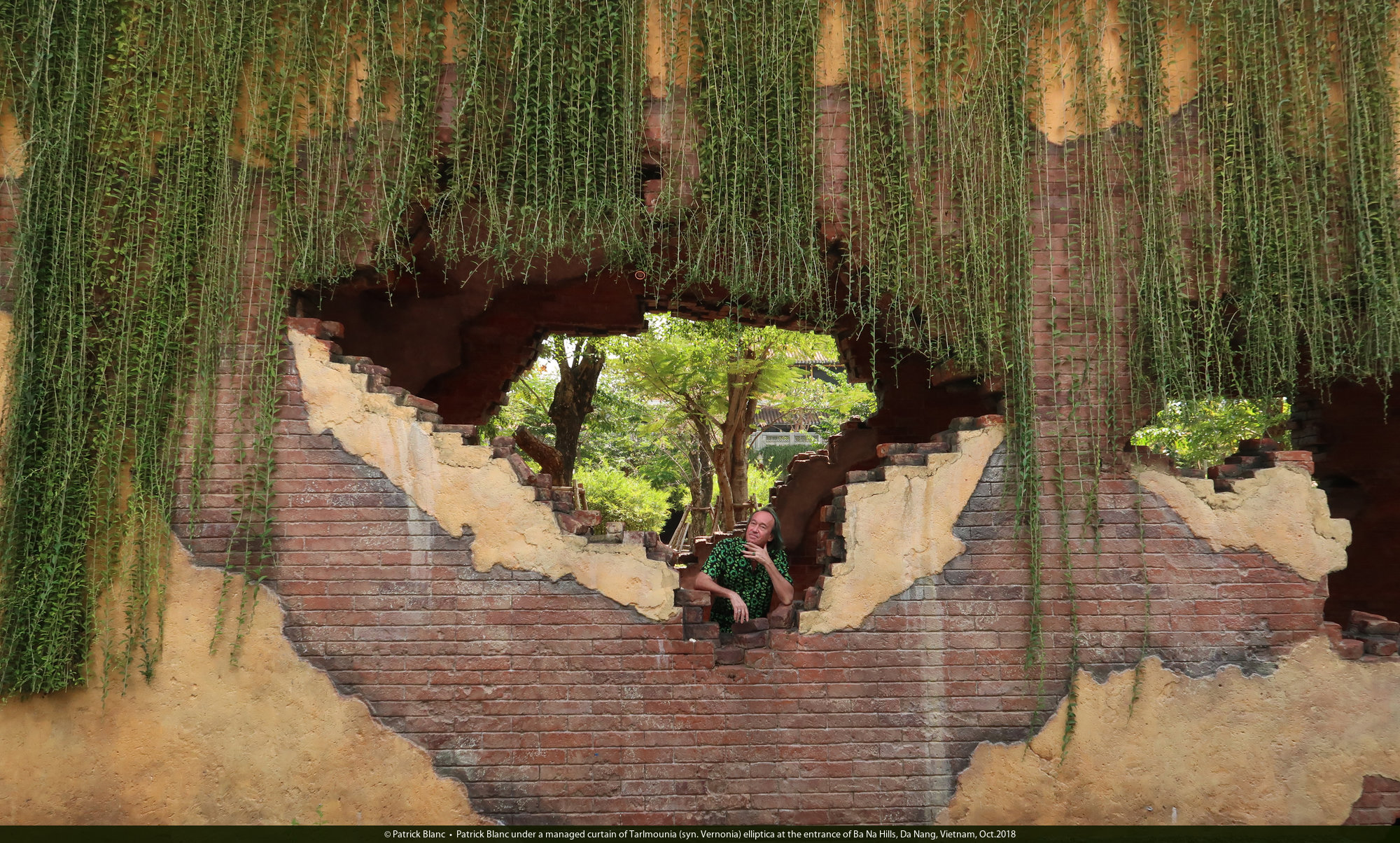Patrick Blanc under a managed curtain of Tarlmounia (syn. Vernonia) elliptica at the entrance of Ba Na Hills, Da Nang, Vietnam, Oct.2018