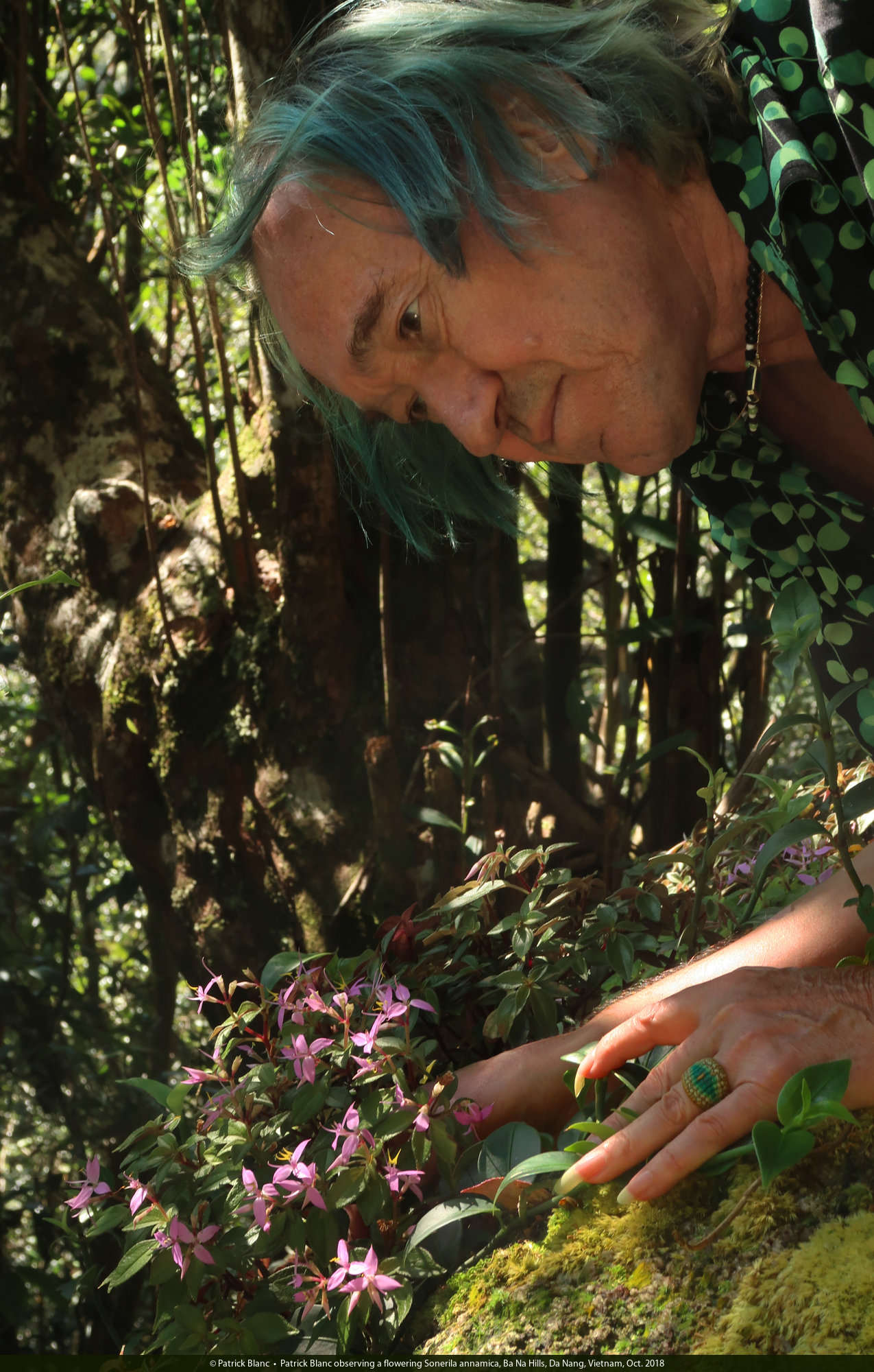 Patrick Blanc observing a flowering Sonerila annamica, Ba Na Hills, Da Nang, Vietnam, Oct. 2018