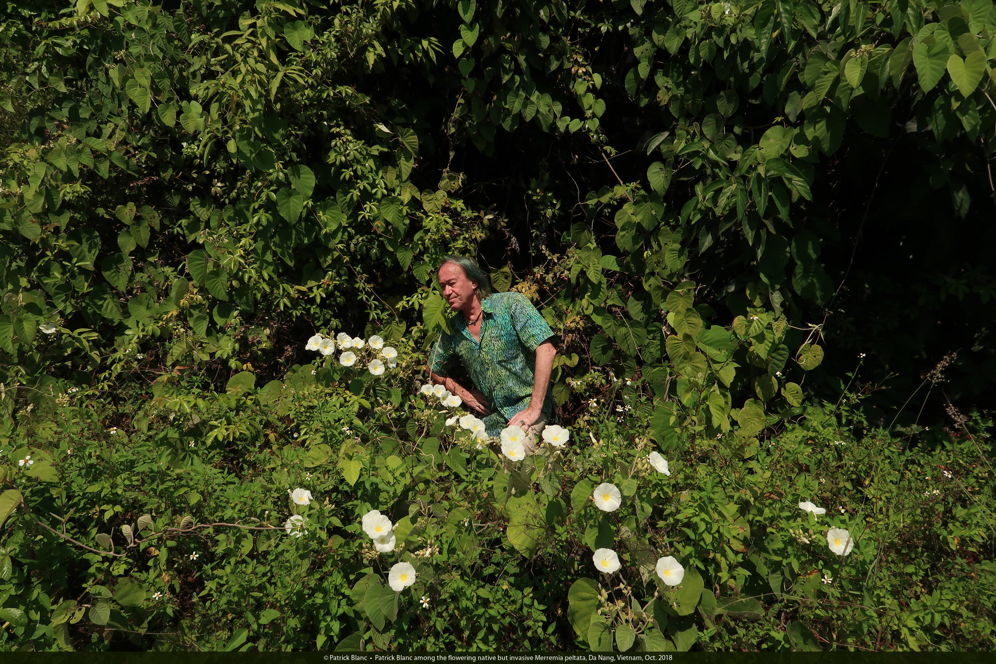 Patrick Blanc among the flowering native but invasive Merremia peltata, Da Nang, Vietnam, Oct. 2018