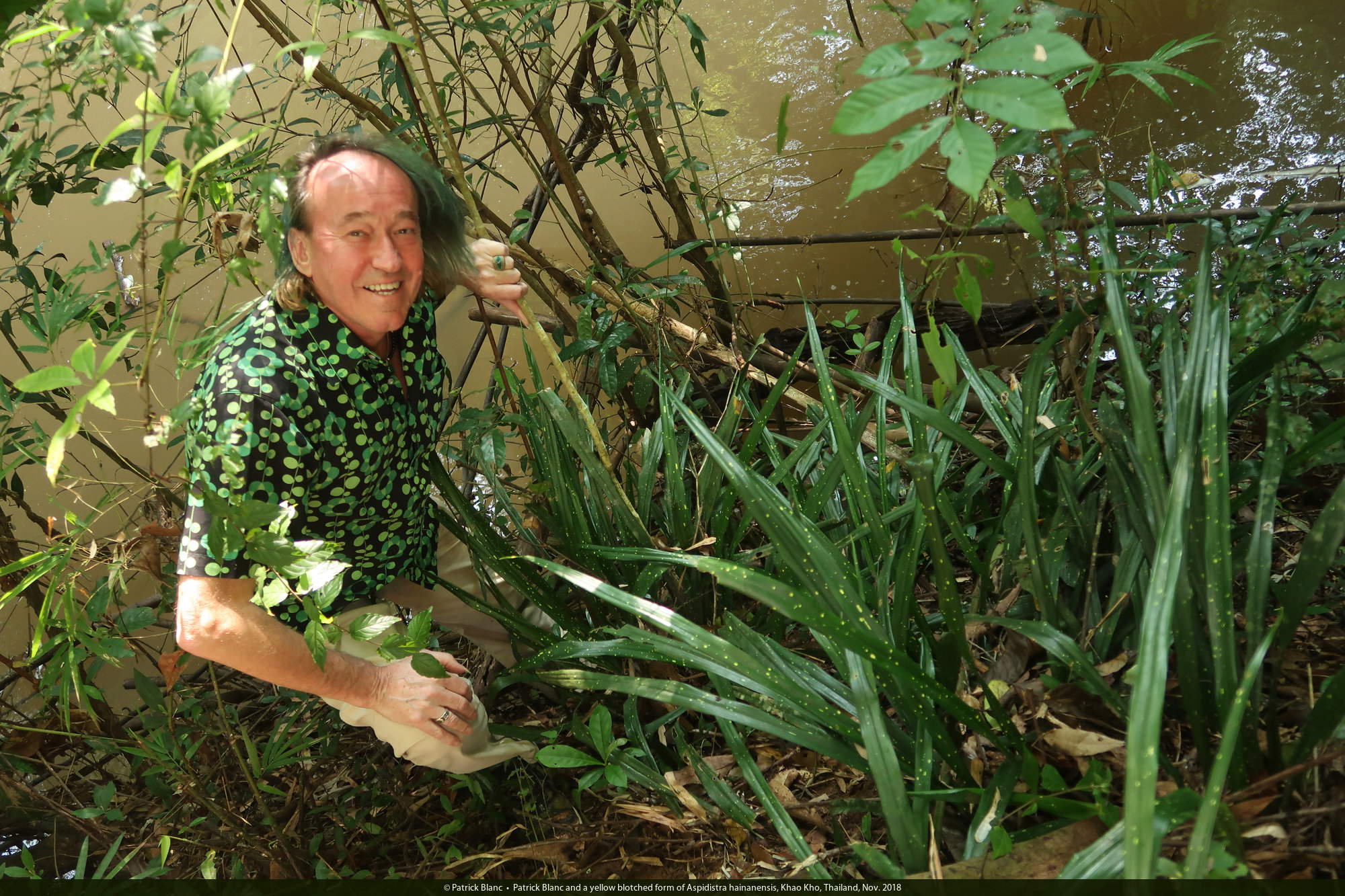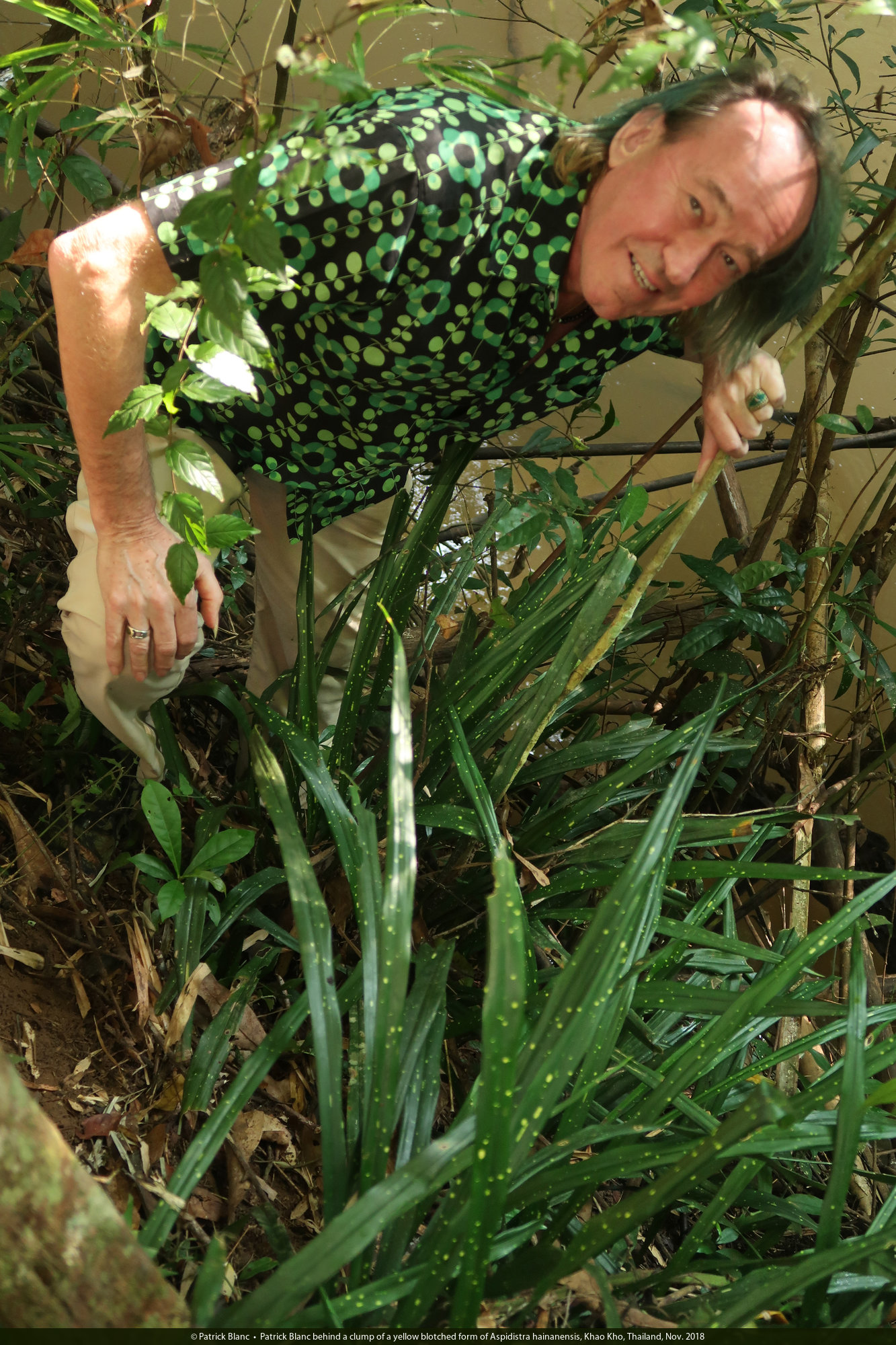 Patrick Blanc behind a clump of a yellow blotched form of Aspidistra hainanensis, Khao Kho, Thailand, Nov. 2018