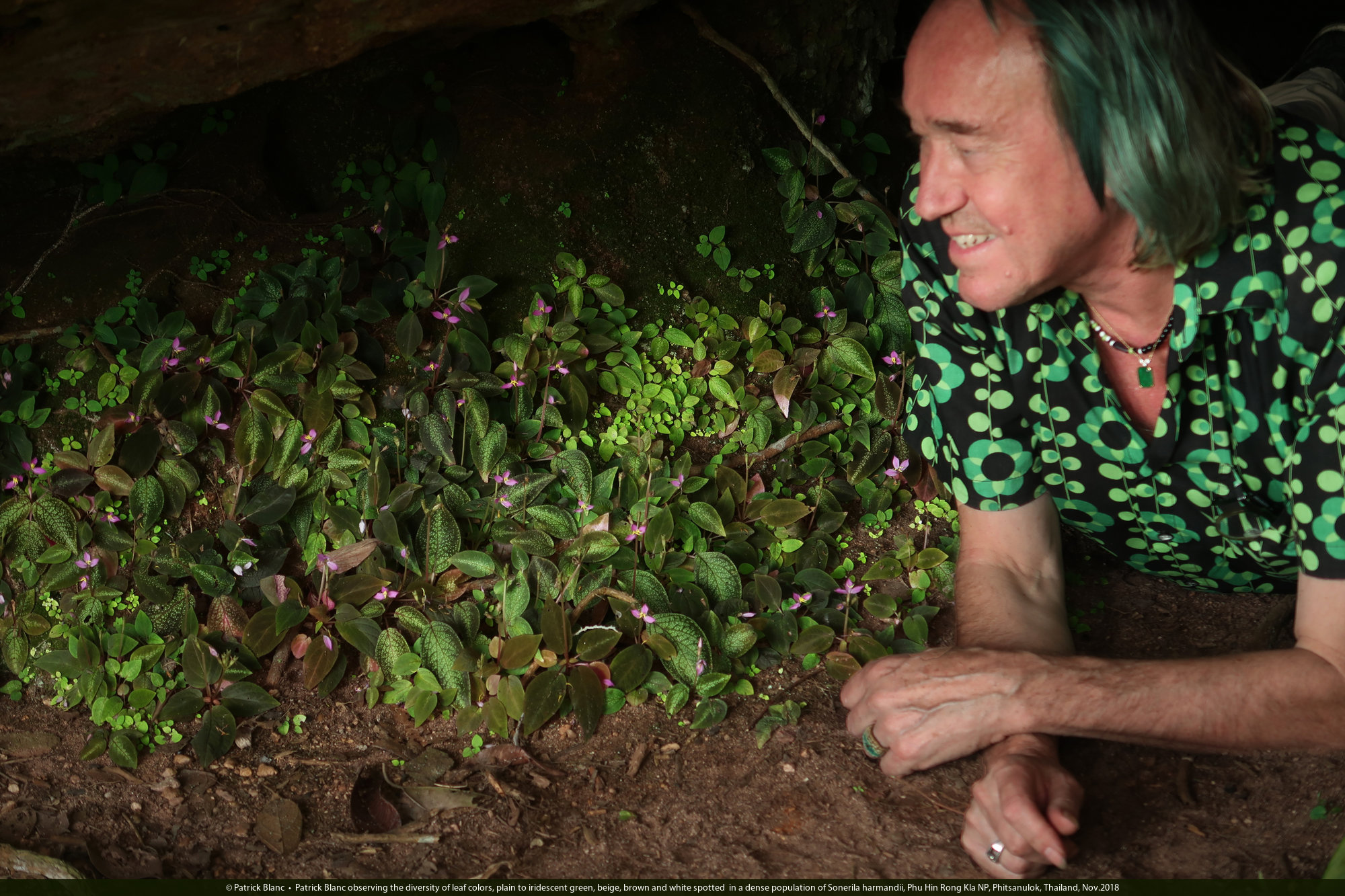 Patrick Blanc observing the diversity of leaf colors, plain to iridescent green, beige, brown and white spotted in a dense population of Sonerila harmandii, Phu Hin Rong Kla NP, Phitsanulok, Thailand, Nov.2018