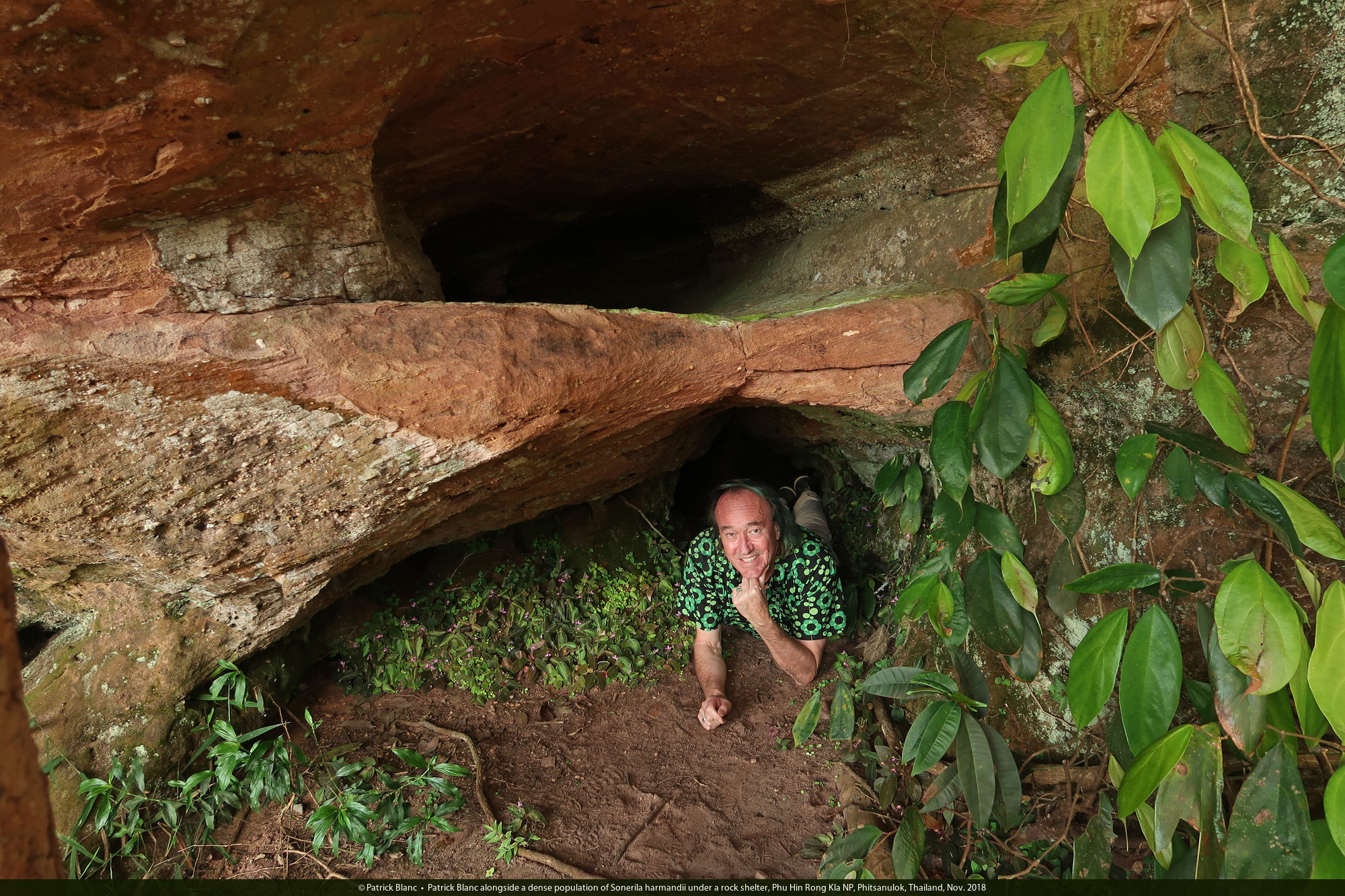 Patrick Blanc alongside a dense population of Sonerila harmandii under a rock shelter, Phu Hin Rong Kla NP, Phitsanulok, Thailand, Nov. 2018