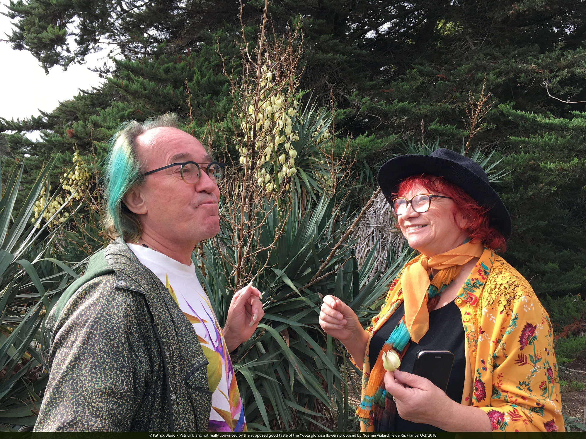Patrick Blanc not really convinced by the supposed good taste of the Yucca gloriosa flowers proposed by Noemie Vialard, Ile de Re, France, Oct. 2018