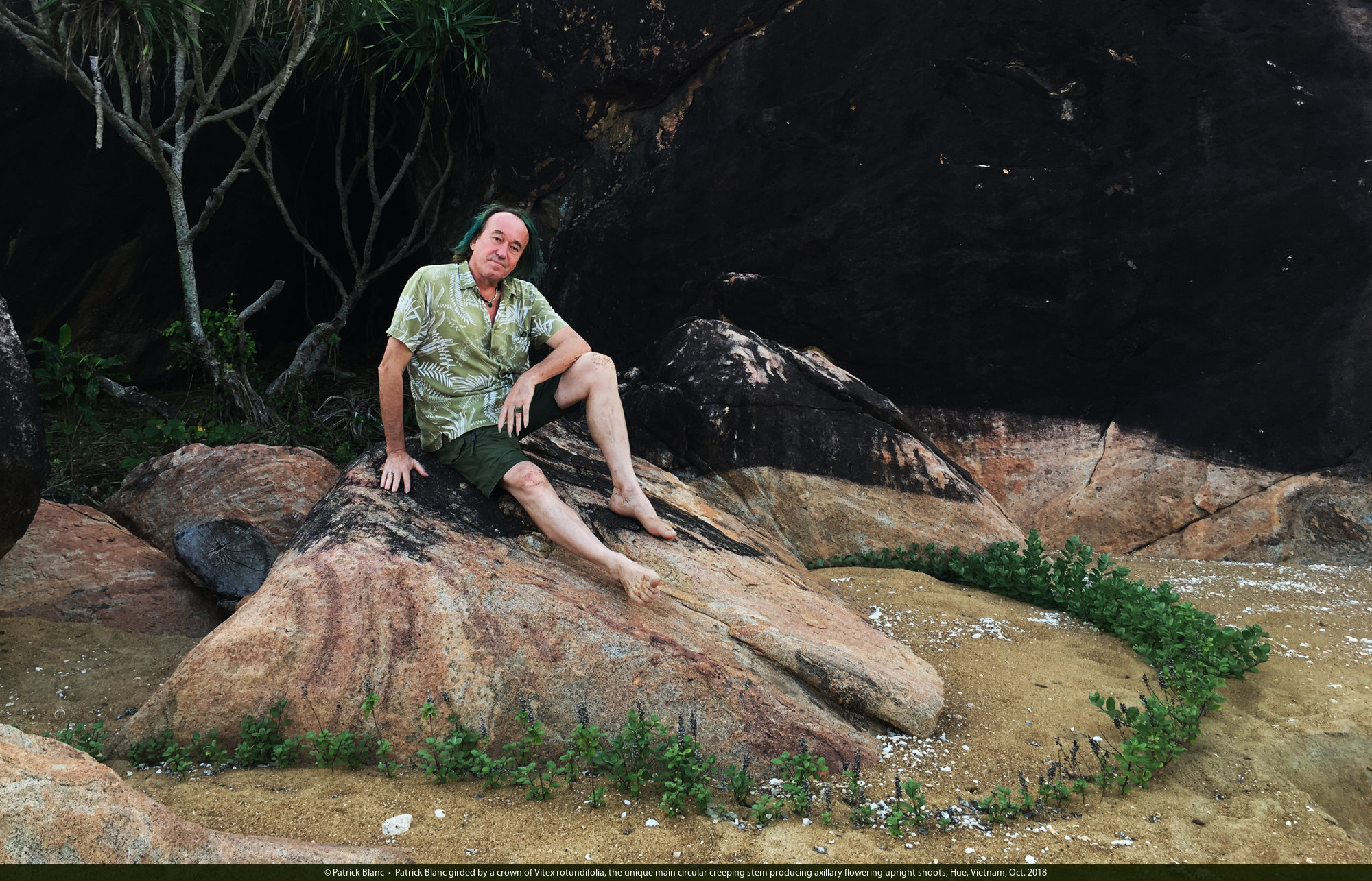 Patrick Blanc girded by a crown of Vitex rotundifolia, the unique main circular creeping stem producing axillary flowering upright shoots, Hue, Vietnam, Oct. 2018