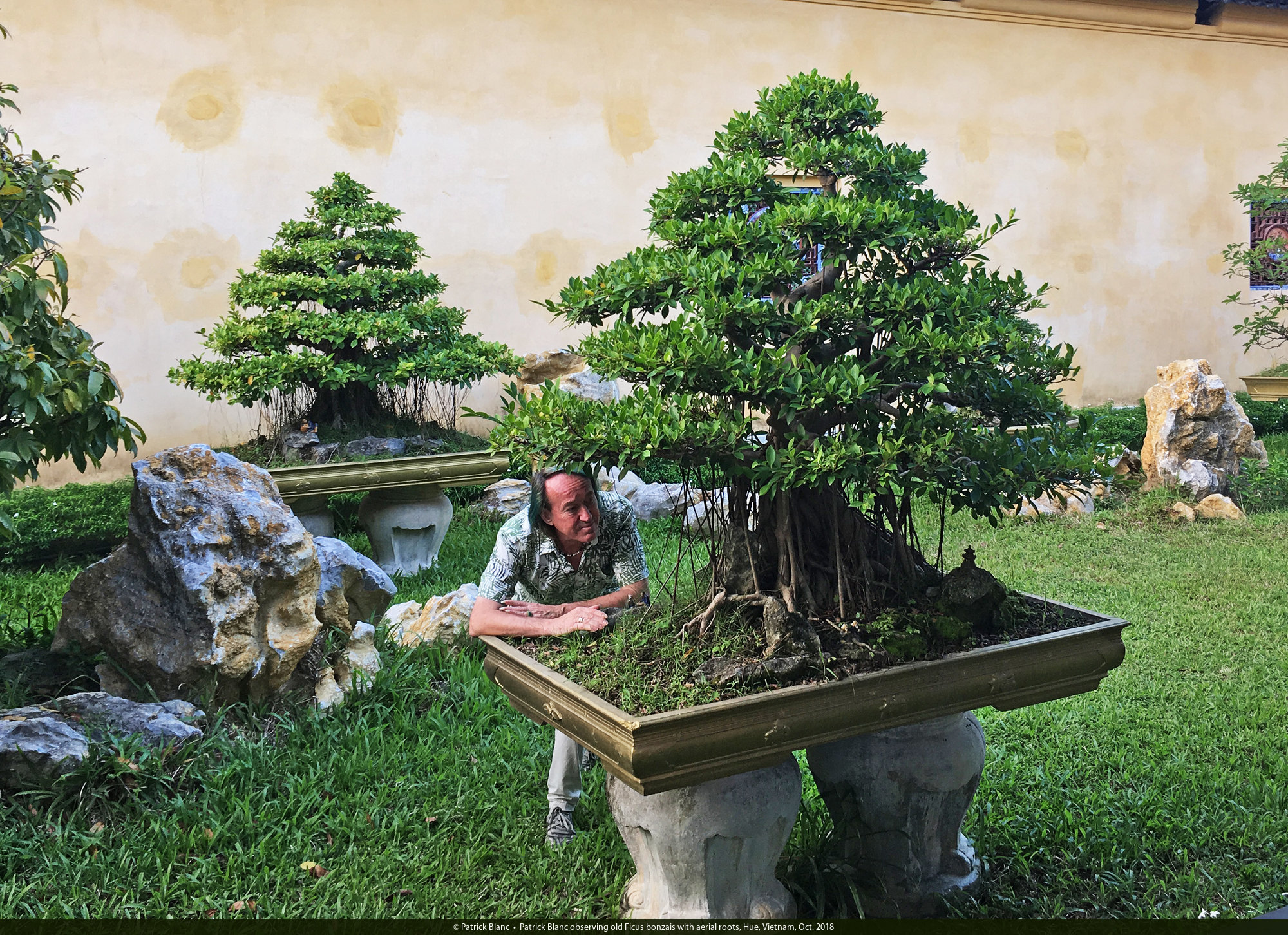 Patrick Blanc observing old Ficus bonzais with aerial roots, Hue, Vietnam, Oct. 2018