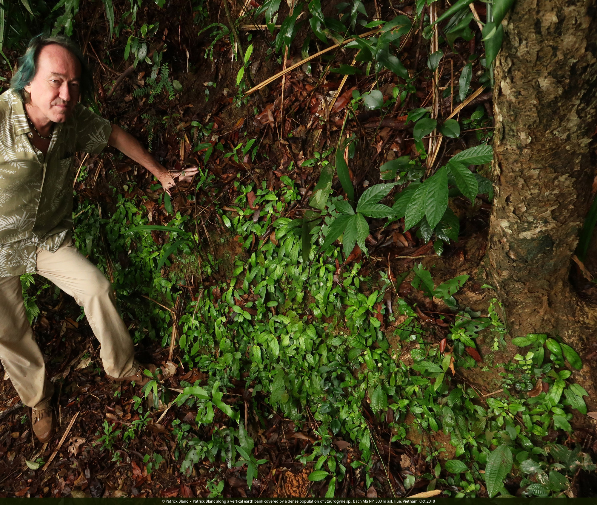 Patrick Blanc along a vertical earth bank covered by a dense population of Staurogyne sp., Bach Ma NP, 500 m asl, Hue, Vietnam, Oct.2018