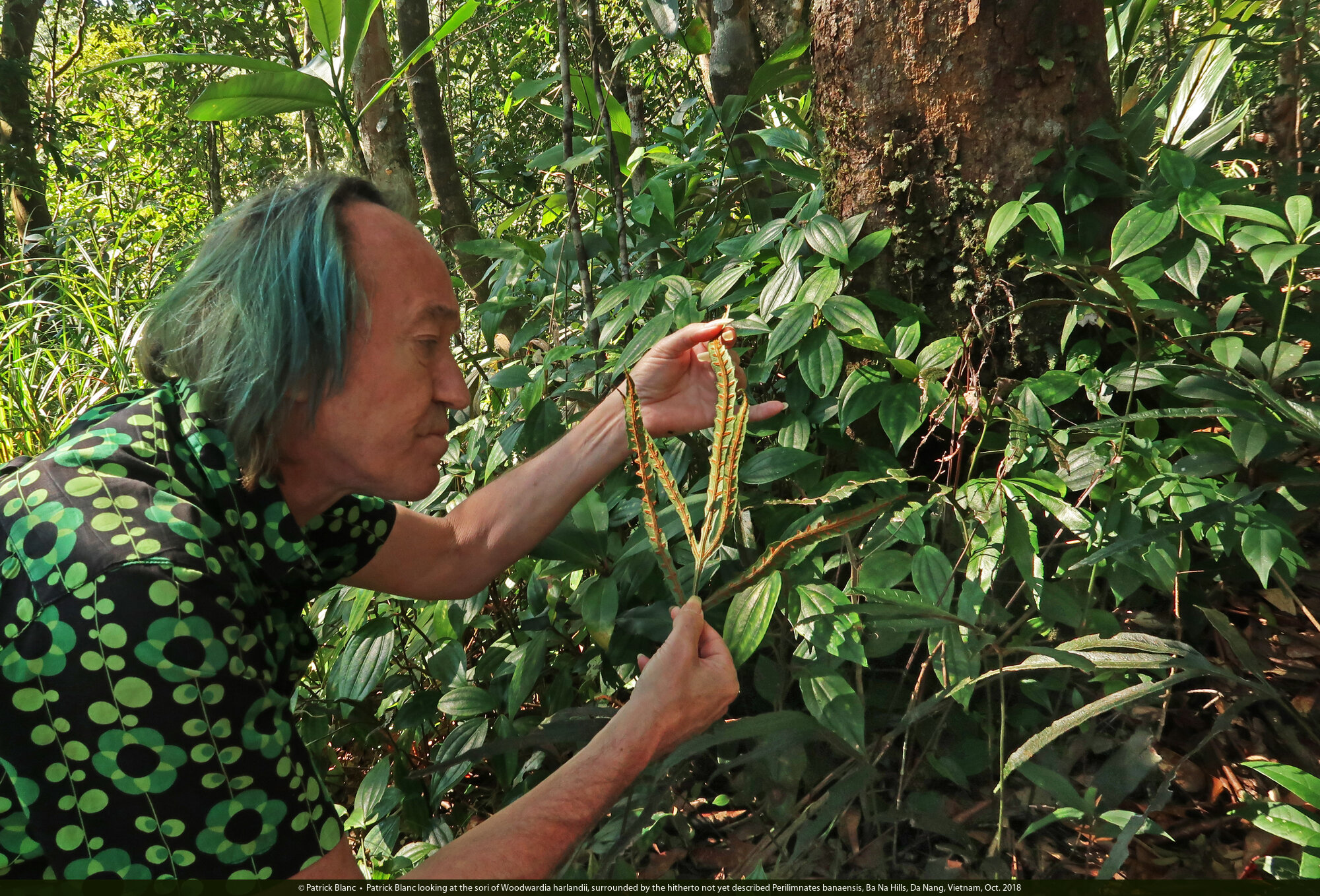 Patrick Blanc observing the sori of Woodwardia harlandii, Ba Na Hills, Da Nang, Vietnam, Oct. 2018