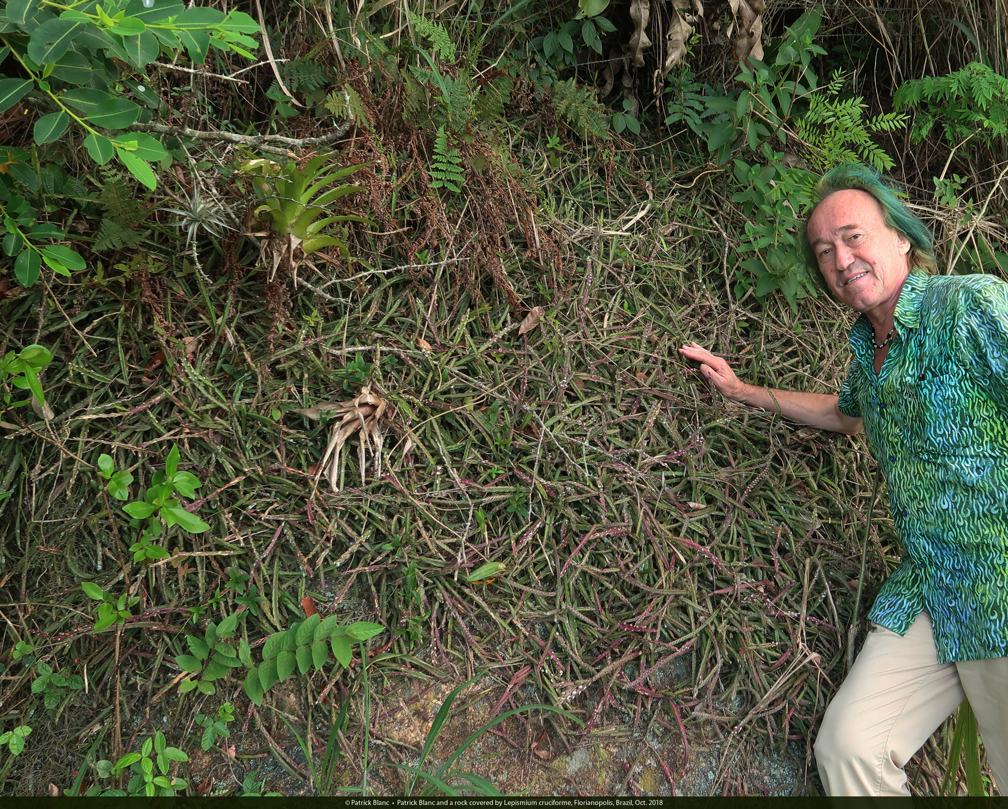 Patrick Blanc and a rock covered by Lepismium cruciforme, Florianopolis, Brazil, Oct. 2018