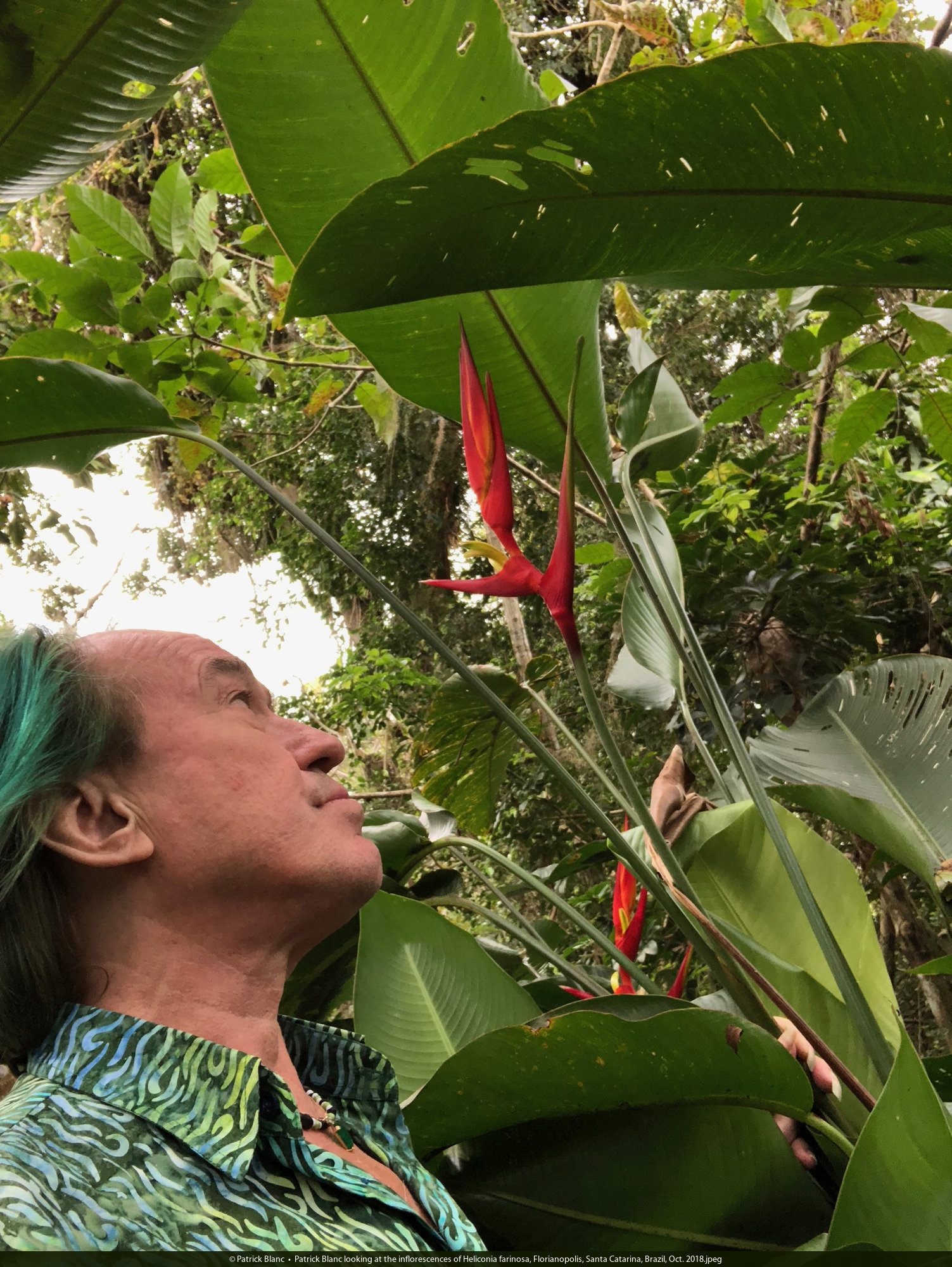 Patrick Blanc looking at the inflorescences of Heliconia farinosa, Florianopolis, Santa Catarina, Brazil, Oct. 2018.jpeg