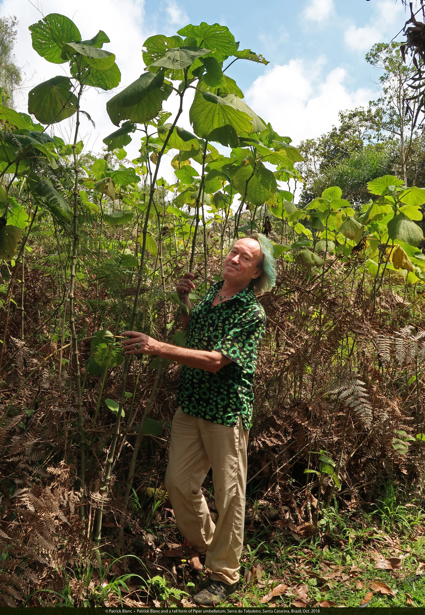 Patrick Blanc and a tall form of Piper umbellatum, Serra do Tabuleiro, Santa Catarina, Brazil, Oct. 2018