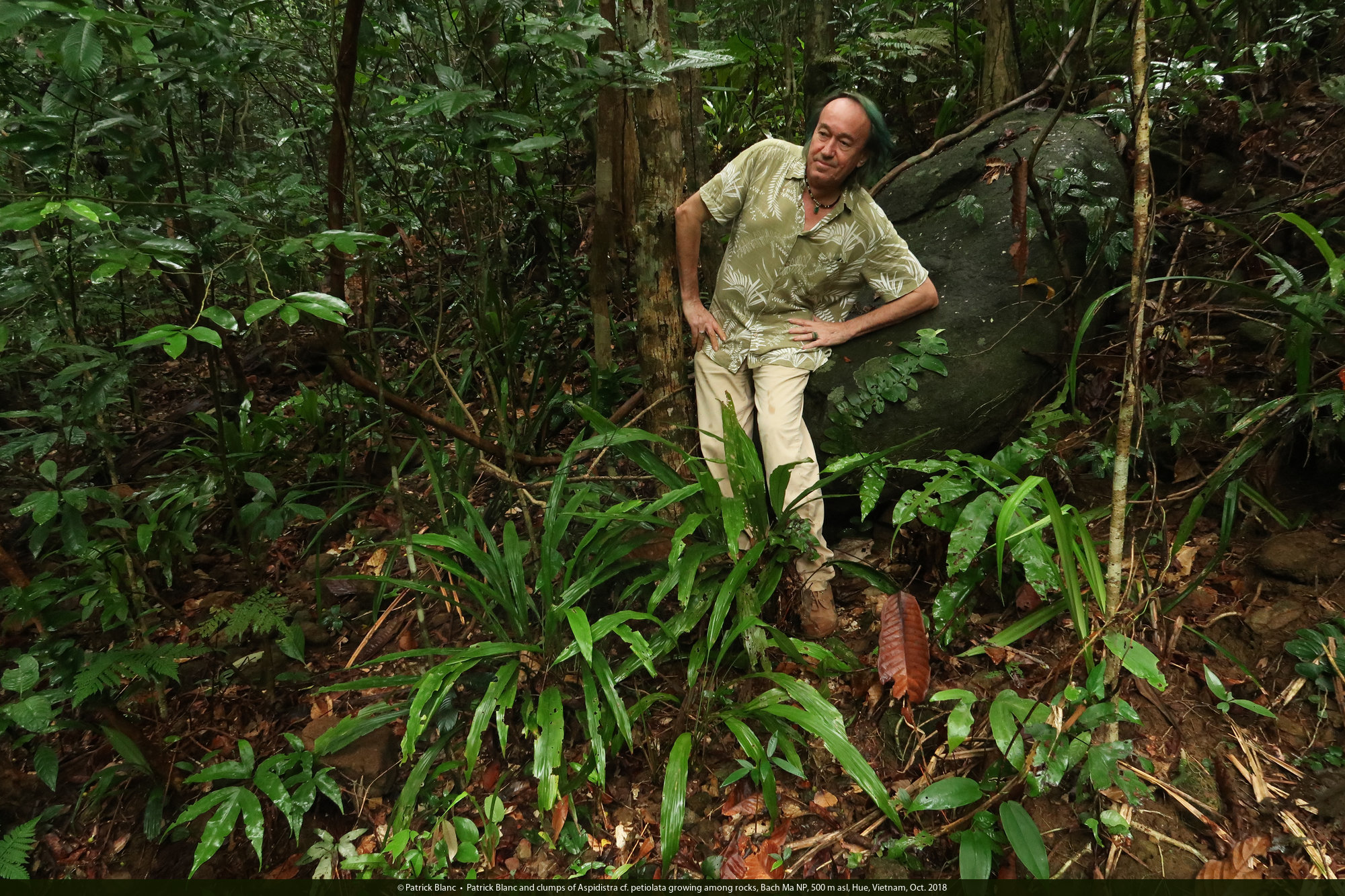 Patrick Blanc and a clump of Aspidistra cf. petiolata growing among rocks, Bach Ma NP, 500 m asl, Hue, Vietnam, Oct. 2018