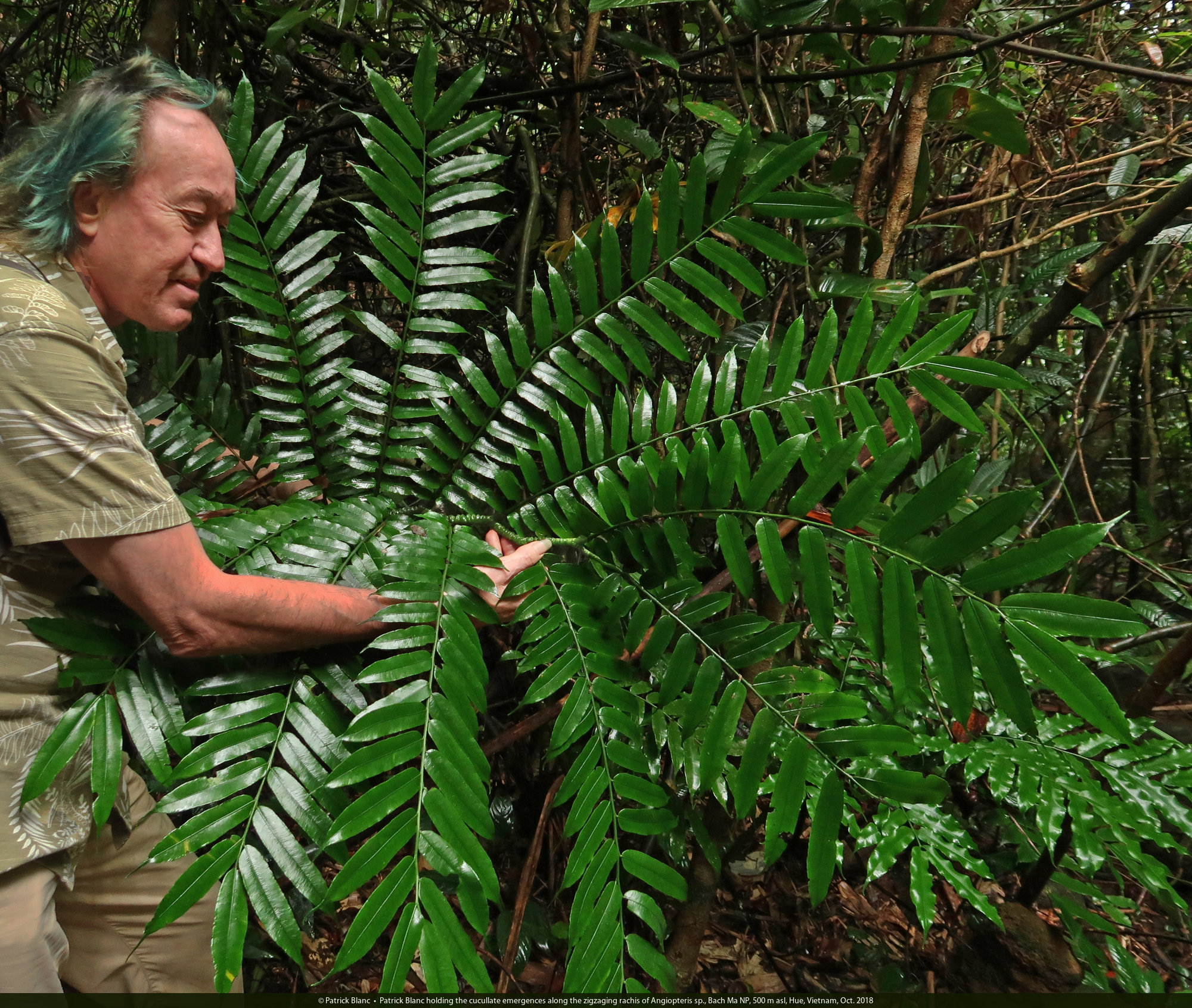 Patrick Blanc holding the cucullate emergences along the zigzaging rachis of Angiopteris sp., Bach Ma NP, 500 m asl, Hue, Vietnam, Oct. 2018