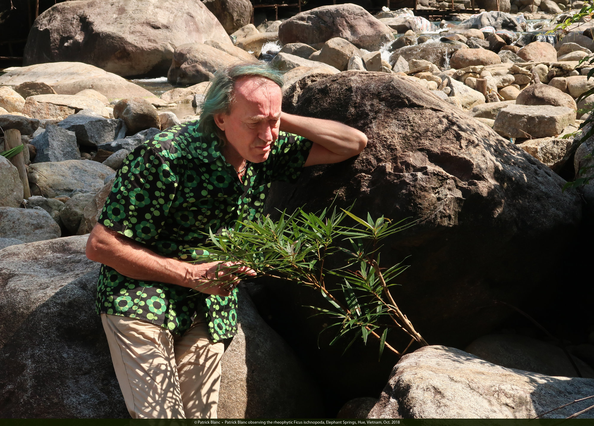 Patrick Blanc observing the rheophytic Ficus ischnopoda, Elephant Springs, Hue, Vietnam, Oct. 2018