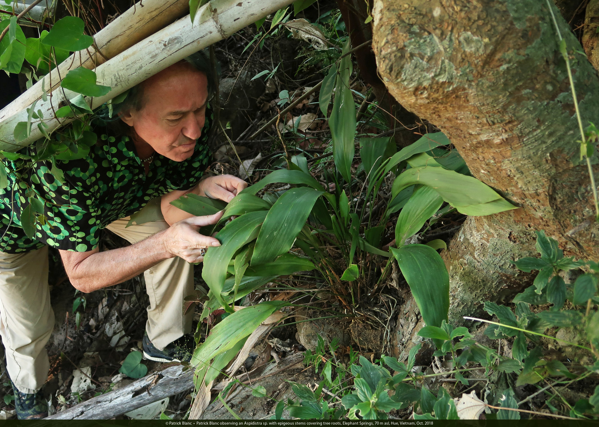 Patrick Blanc observing an Aspidistra sp. with epigeous stems covering tree roots, Elephant Springs, 70 m asl, Hue, Vietnam, Oct. 2018