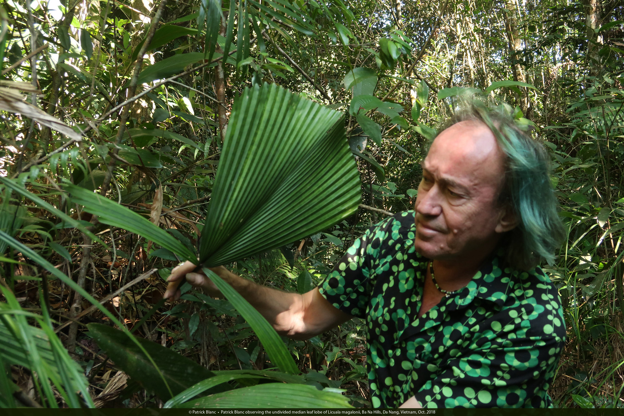 Patrick Blanc observing the undivided median leaf lobe of Licuala magalonii, Ba Na Hills, Da Nang, Vietnam, Oct. 2018