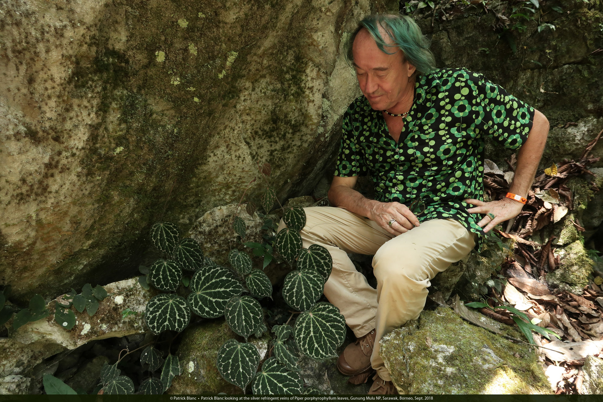 Patrick Blanc looking at the silver refringent veins of Piper porphyrophyllum leaves, Gunung Mulu NP, Sarawak, Borneo, Sept. 2018