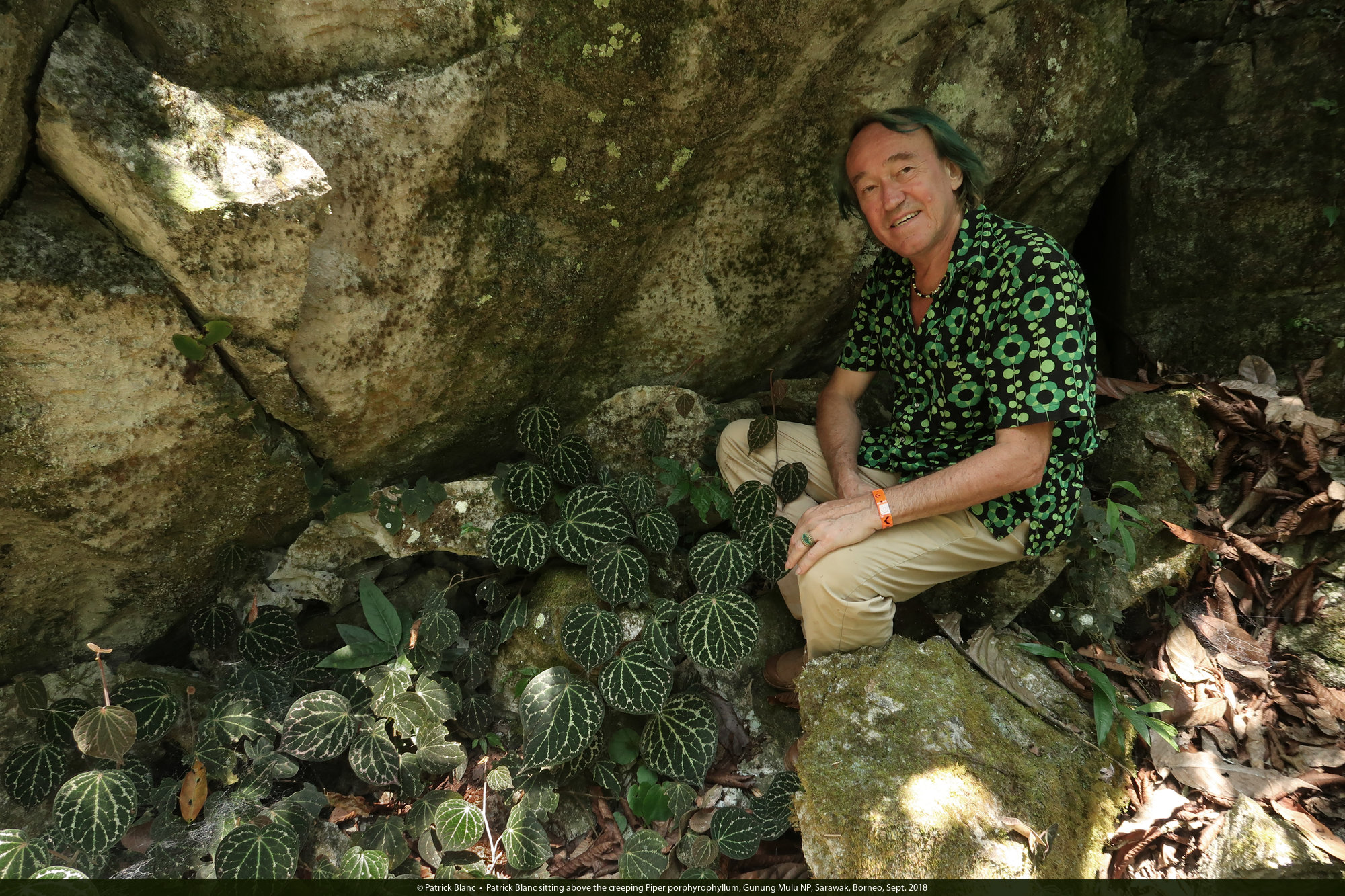 Patrick Blanc sitting above the creeping Piper porphyrophyllum, Gunung Mulu NP, Sarawak, Borneo, Sept. 2018