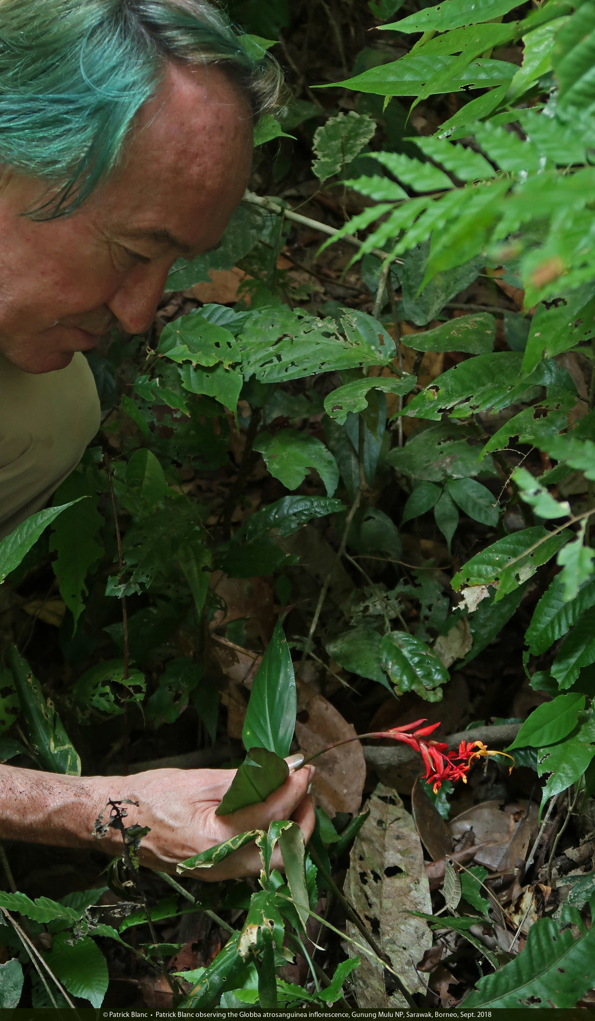 Patrick Blanc observing the Globba atrosanguinea inflorescence, Gunung Mulu NP, Sarawak, Borneo, Sept. 2018