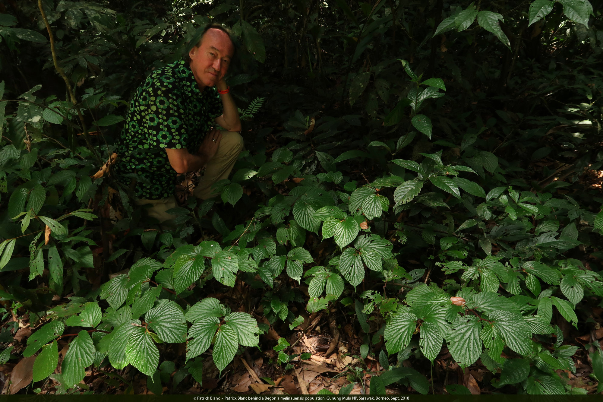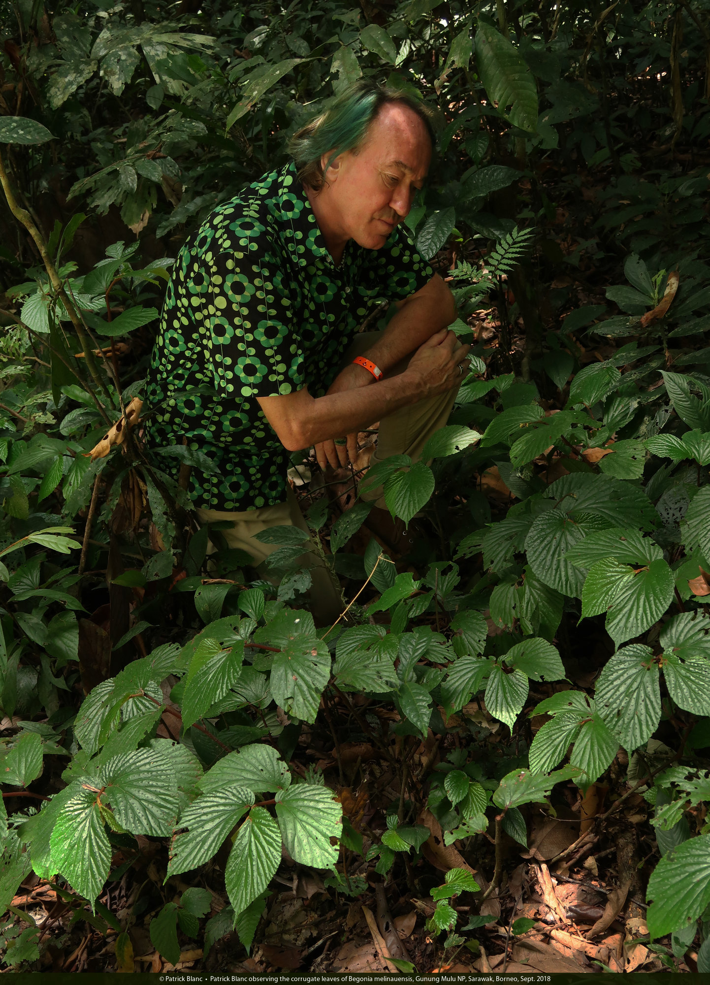 Patrick Blanc observing the corrugate leaves of Begonia melinauensis, Gunung Mulu NP, Sarawak, Borneo, Sept. 2018