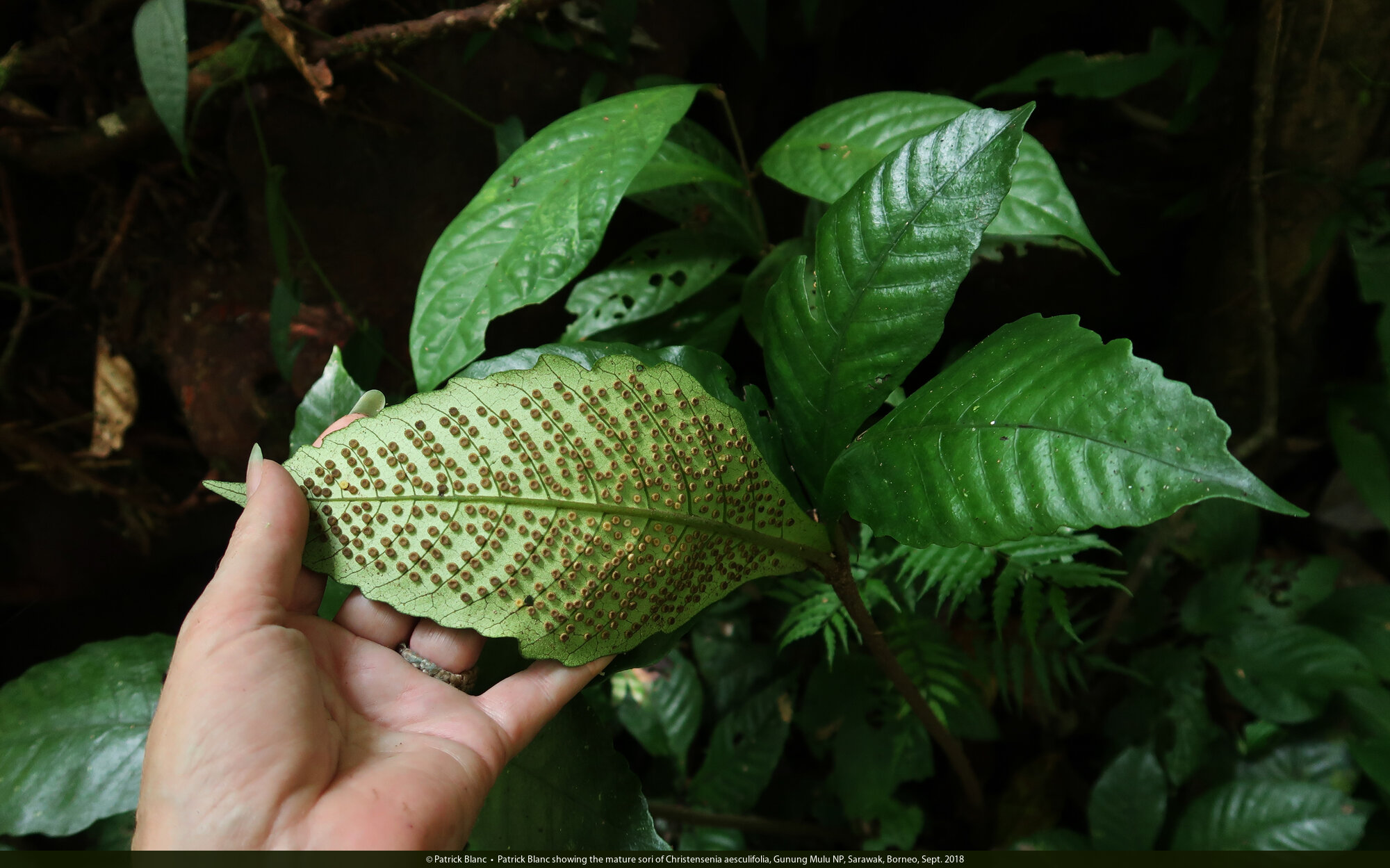 Patrick Blanc showing the mature sori of Christensenia aesculifolia, Gunung Mulu NP, Sarawak, Borneo, Sept. 2018