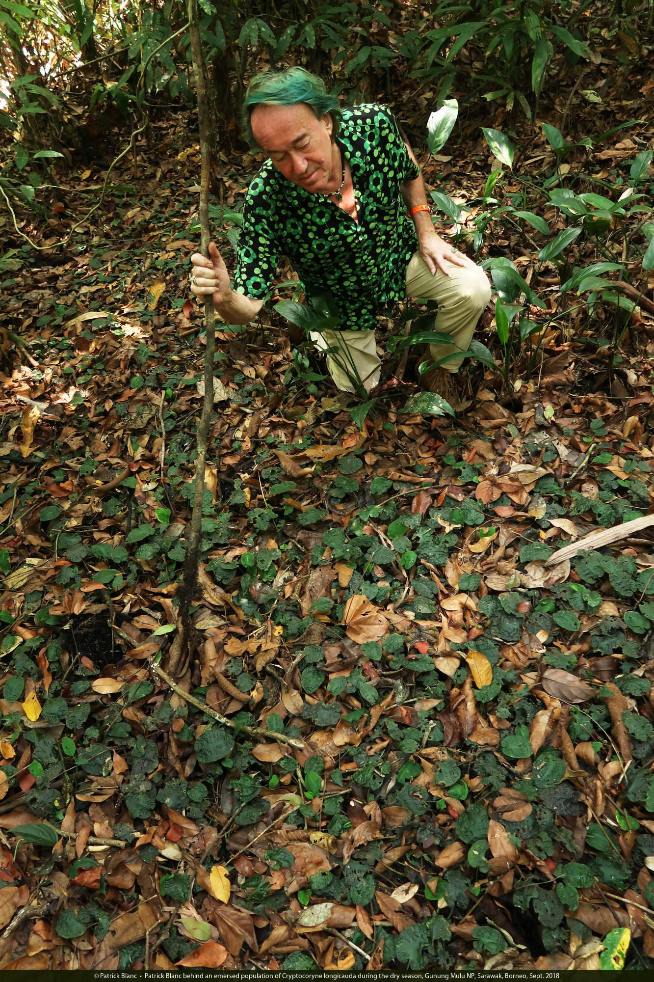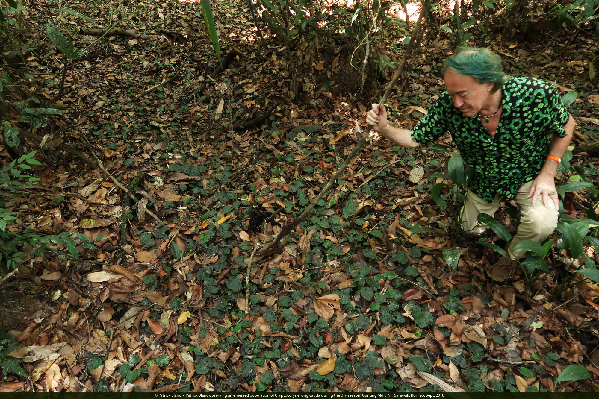 Patrick Blanc observing an emersed population of Cryptocoryne longicauda during the dry season, Gunung Mulu NP, Sarawak, Borneo, Sept. 2018