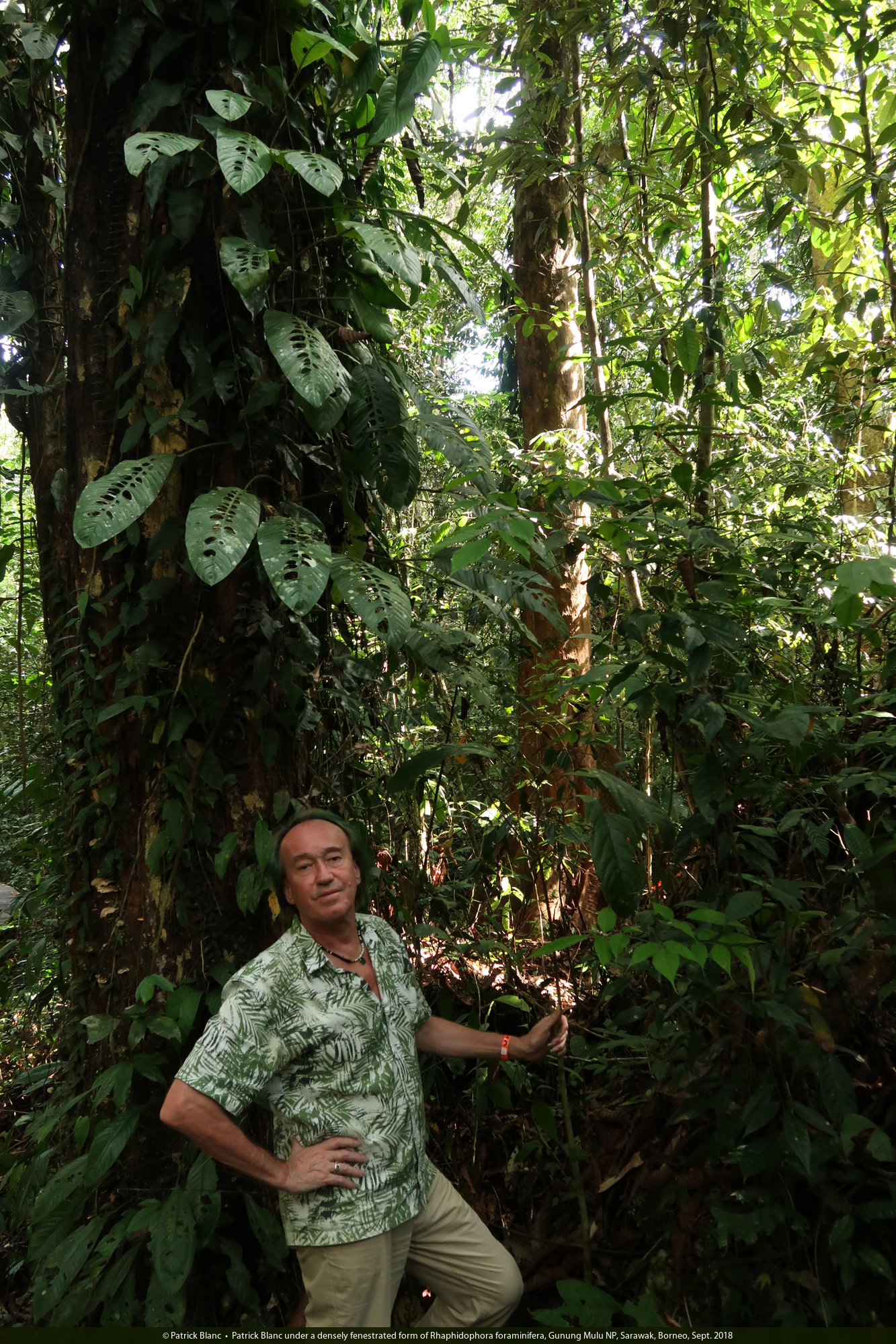 Patrick Blanc under a densely fenestrated form of Rhaphidophora foraminifera, Gunung Mulu NP, Sarawak, Borneo, Sept. 2018