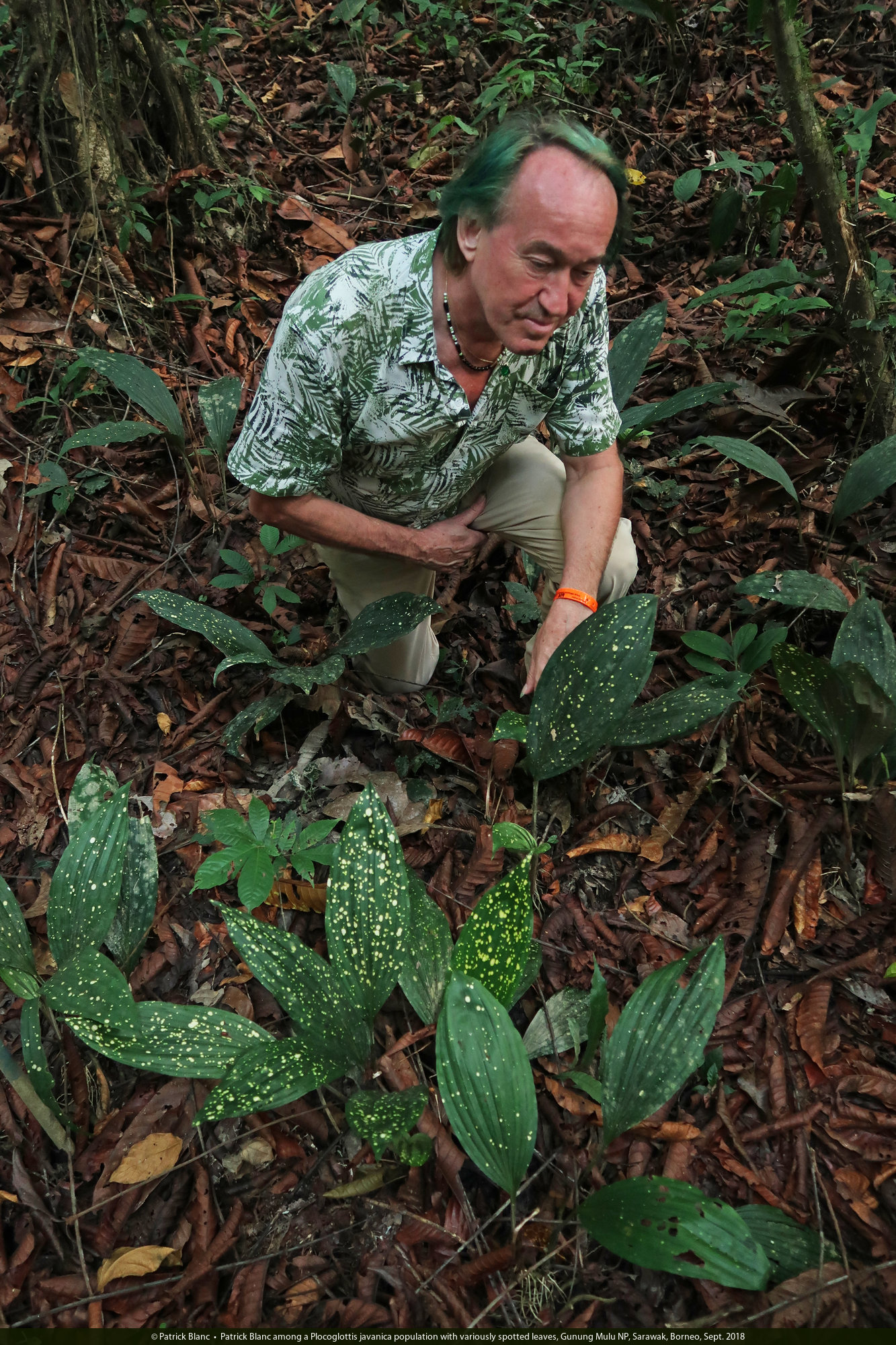 Patrick Blanc among a Plocoglottis javanica population with variously spotted leaves, Gunung Mulu NP, Sarawak, Borneo, Sept. 2018