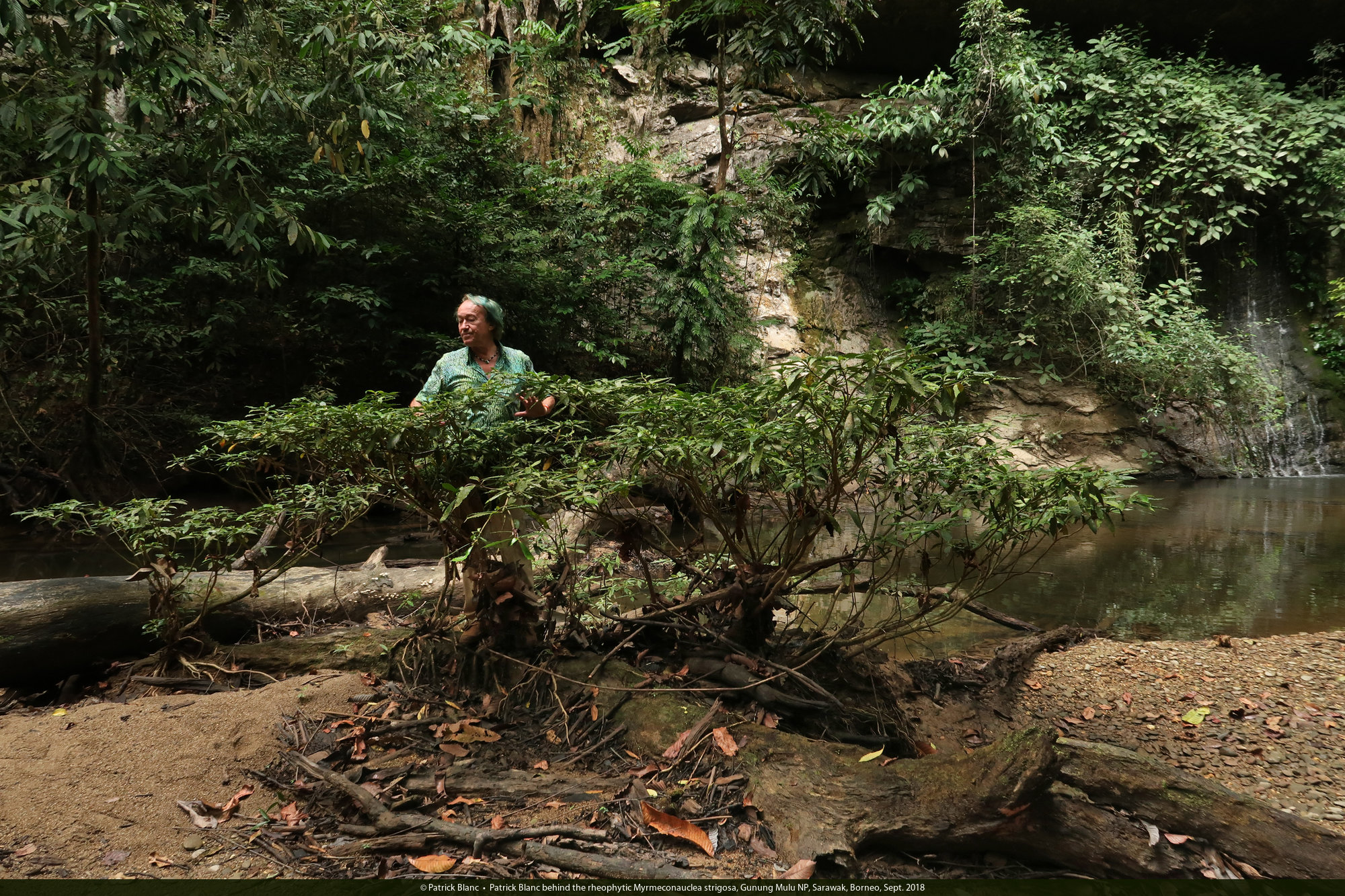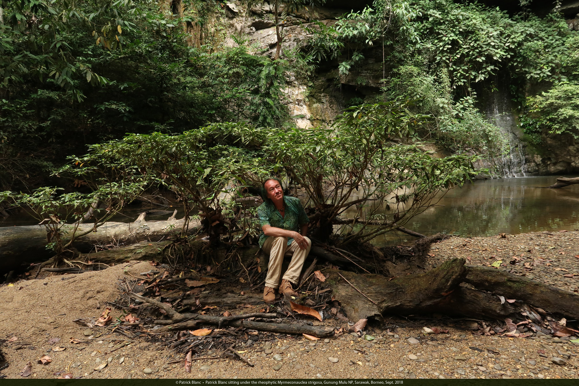 Patrick Blanc sitting under the rheophytic Myrmeconauclea strigosa, Gunung Mulu NP, Sarawak, Borneo, Sept. 2018