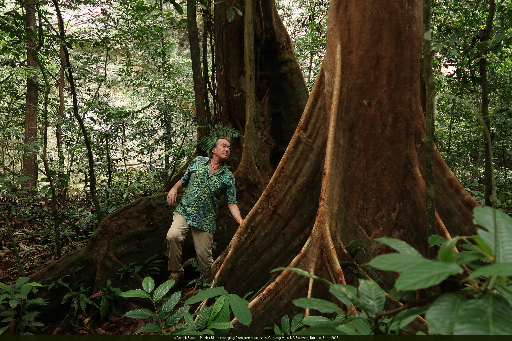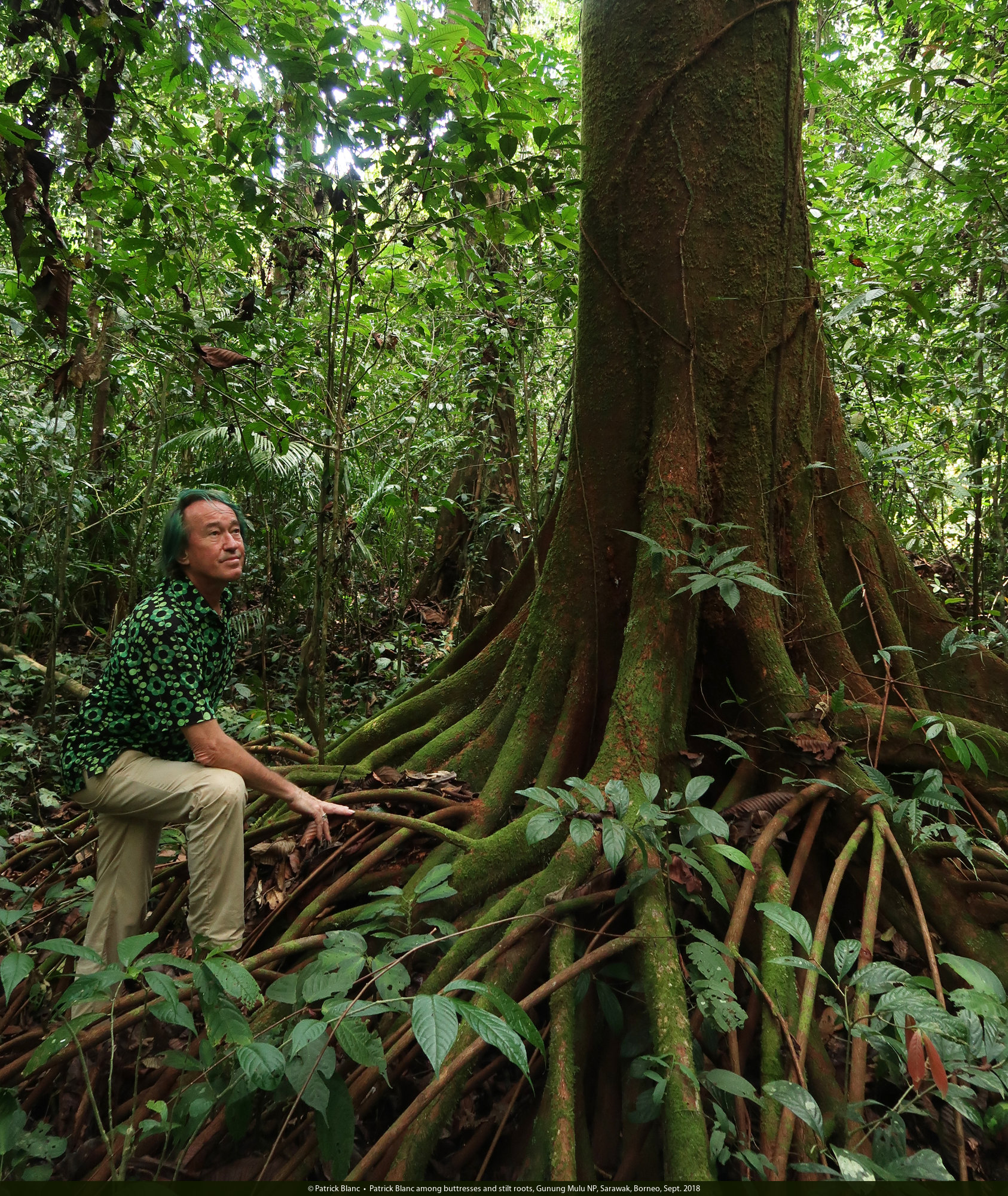 Patrick Blanc among buttresses and stilt roots, Gunung Mulu NP, Sarawak, Borneo, Sept. 2018