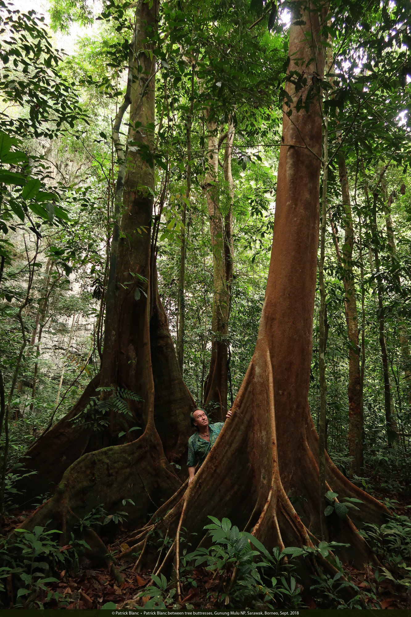 Patrick Blanc between tree buttresses, Gunung Mulu NP, Sarawak, Borneo, Sept. 2018
