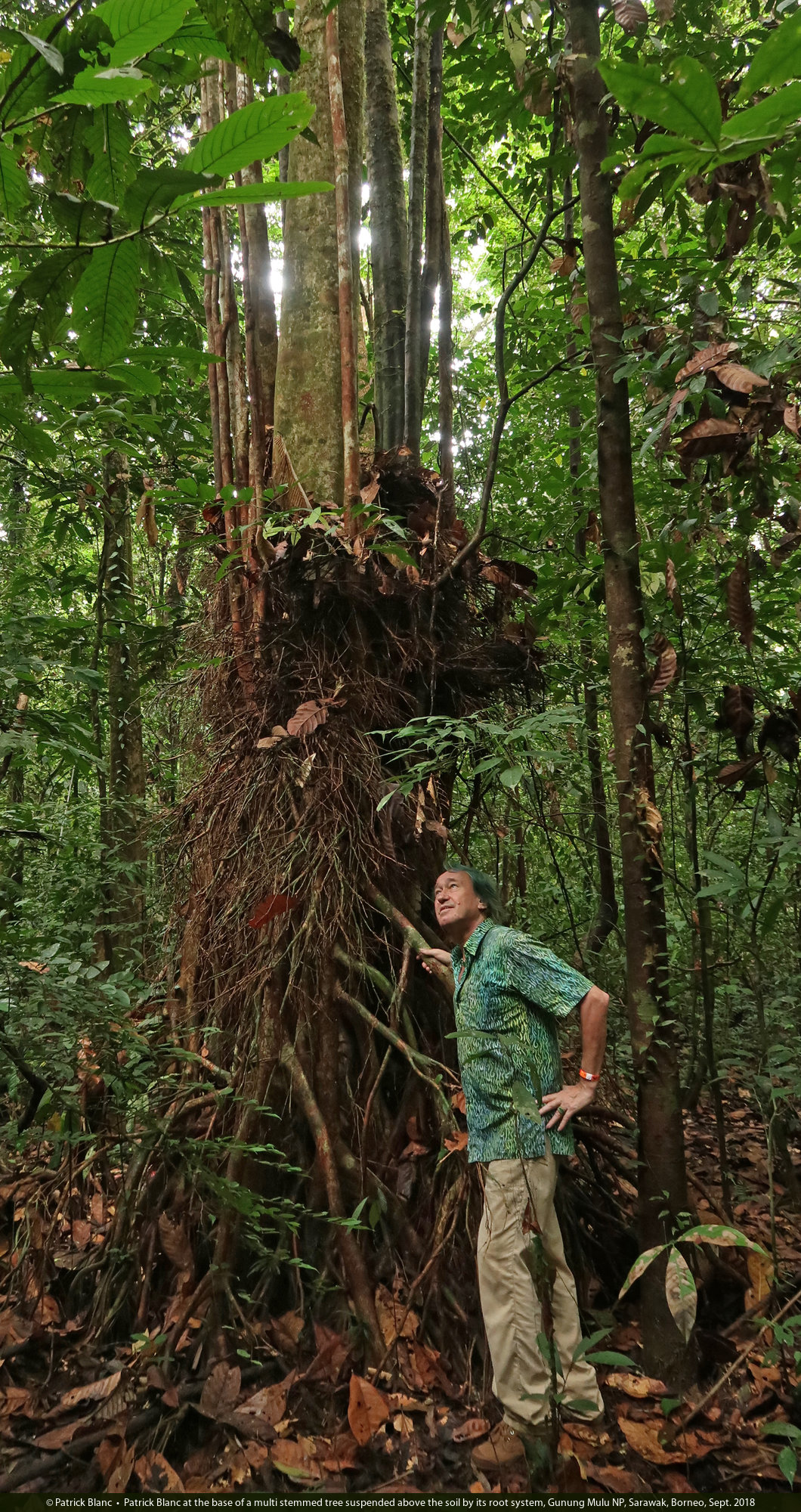 Patrick Blanc at the base of a multi stemmed tree suspended above the soil by its root system, Gunung Mulu NP, Sarawak, Borneo, Sept. 2018