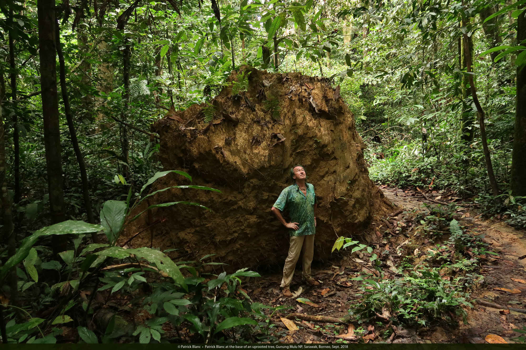 Patrick Blanc at the base of an uprooted tree, Gunung Mulu NP, Sarawak, Borneo, Sept. 2018