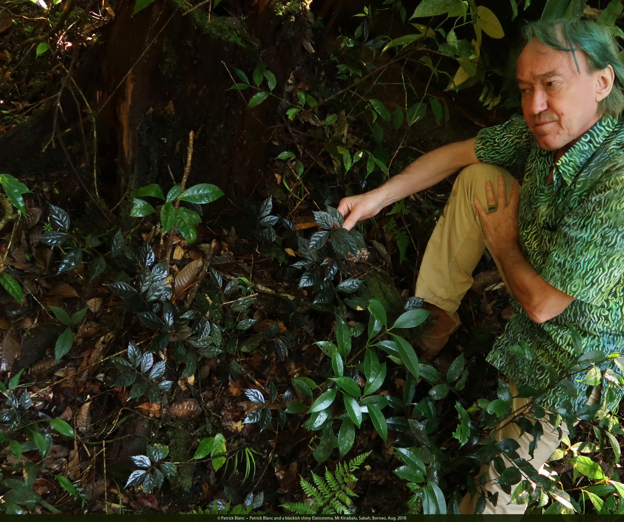 Patrick Blanc and a blackish shiny Elatostema, Mt Kinabalu, Sabah, Borneo, Aug. 2018