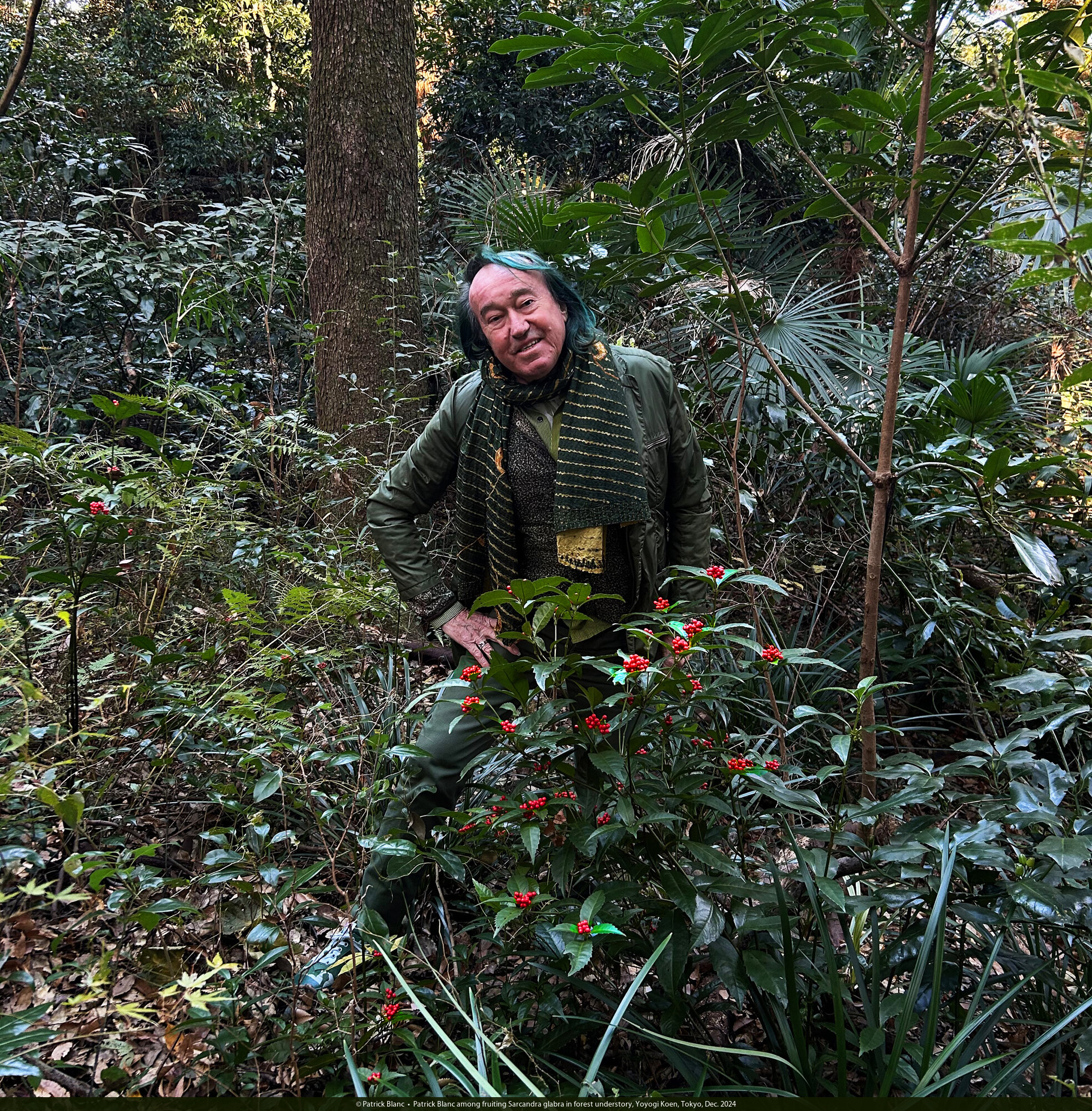 Patrick Blanc among fruiting Sarcandra glabra in forest understory, Yoyogi Koen, Tokyo, Dec. 2024