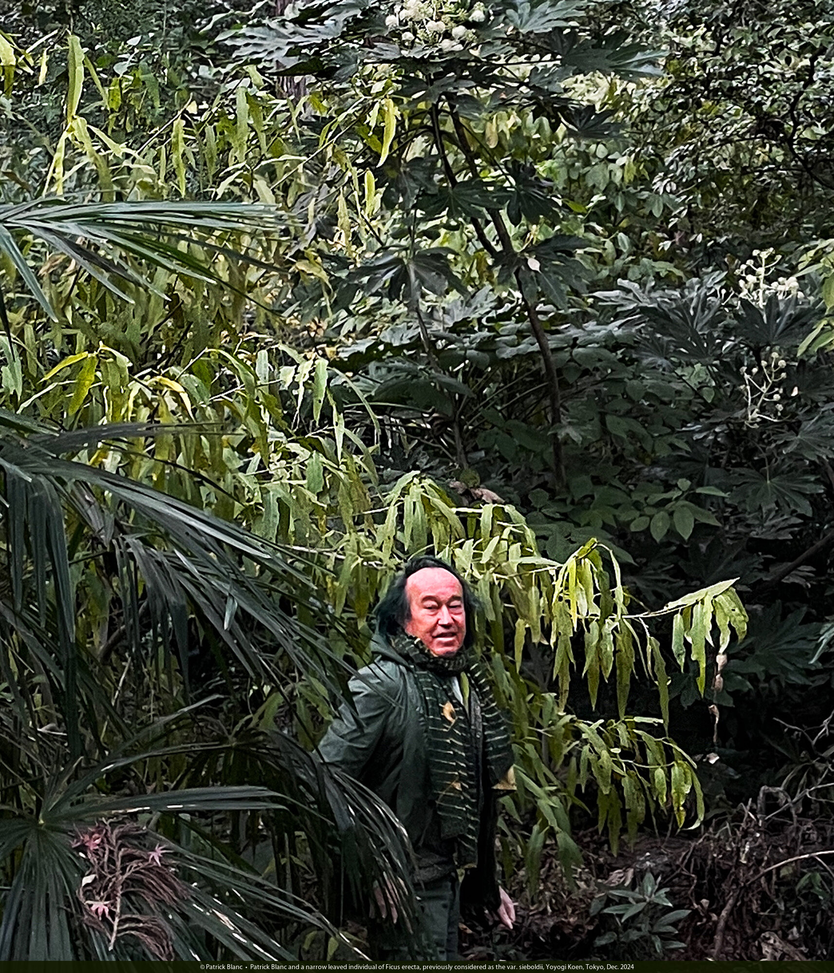 Patrick Blanc and a narrow leaved individual of Ficus erecta, previously considered as the var. sieboldii, Yoyogi Koen, Tokyo, Dec. 2024