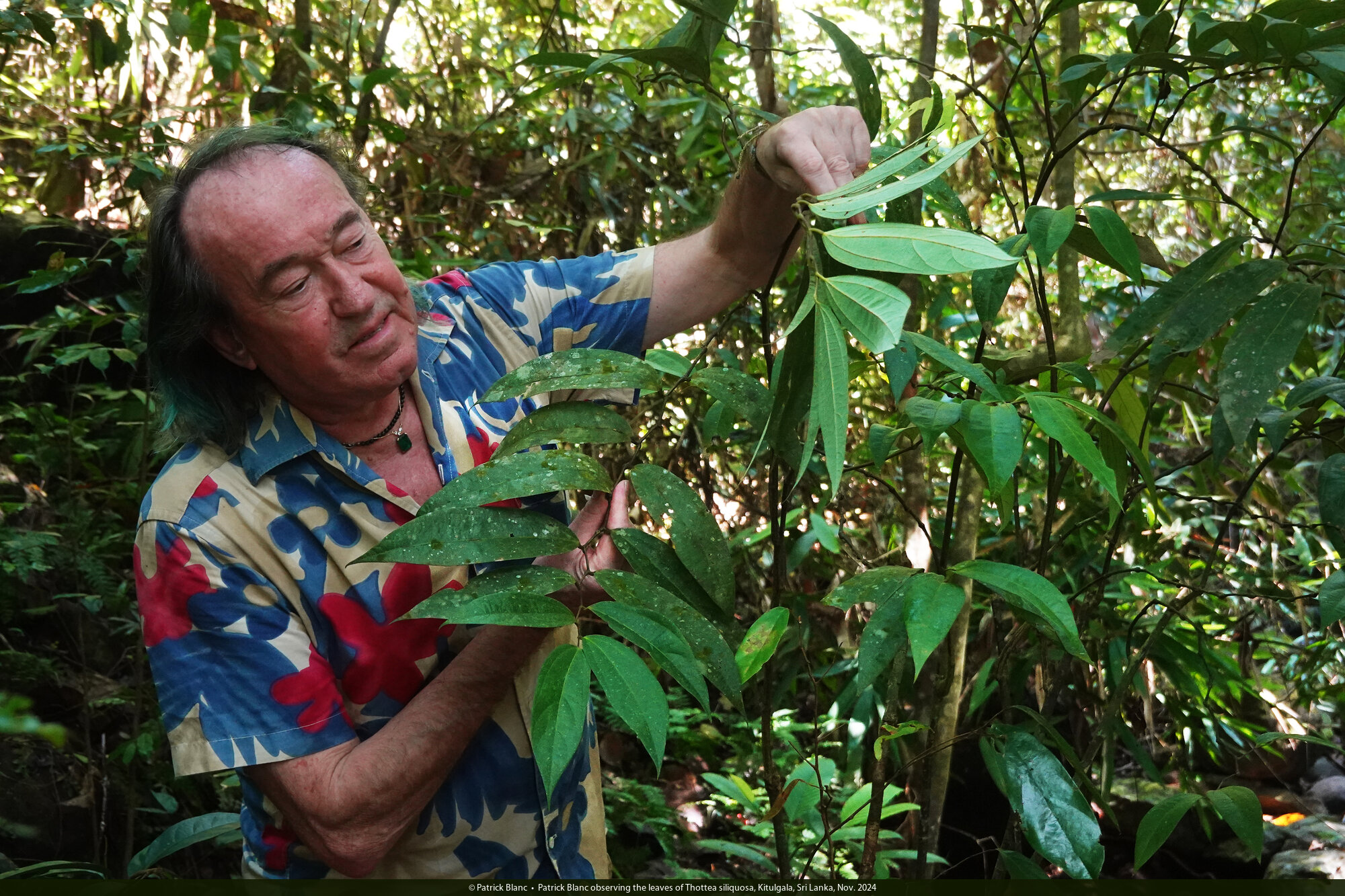 Patrick Blanc observing the leaves of Thottea siliquosa, Kitulgala, Sri Lanka, Nov. 2024