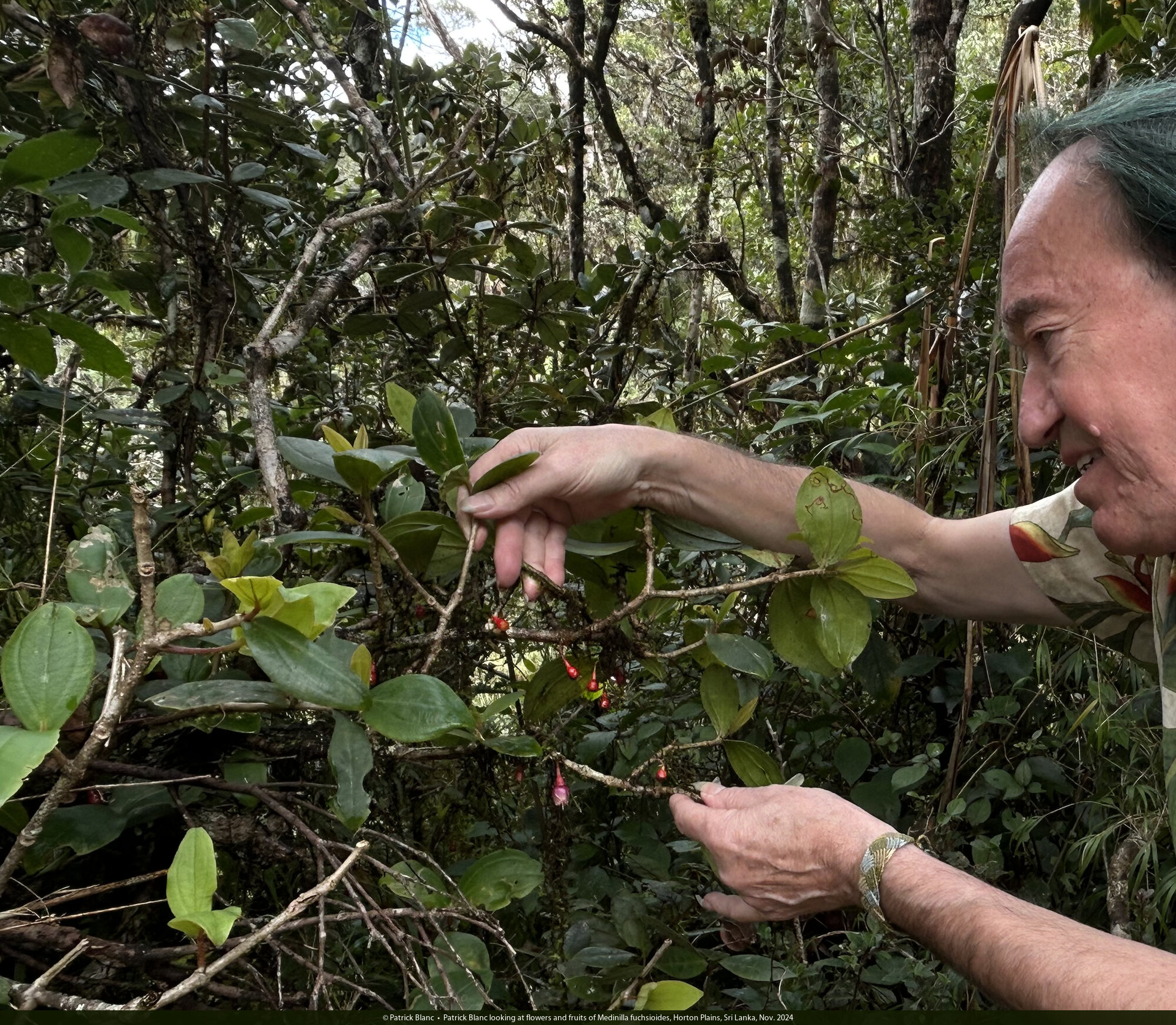 Patrick Blanc looking at flowers and fruits of Medinilla fuchsioides, Horton Plains, Sri Lanka, Nov. 2024