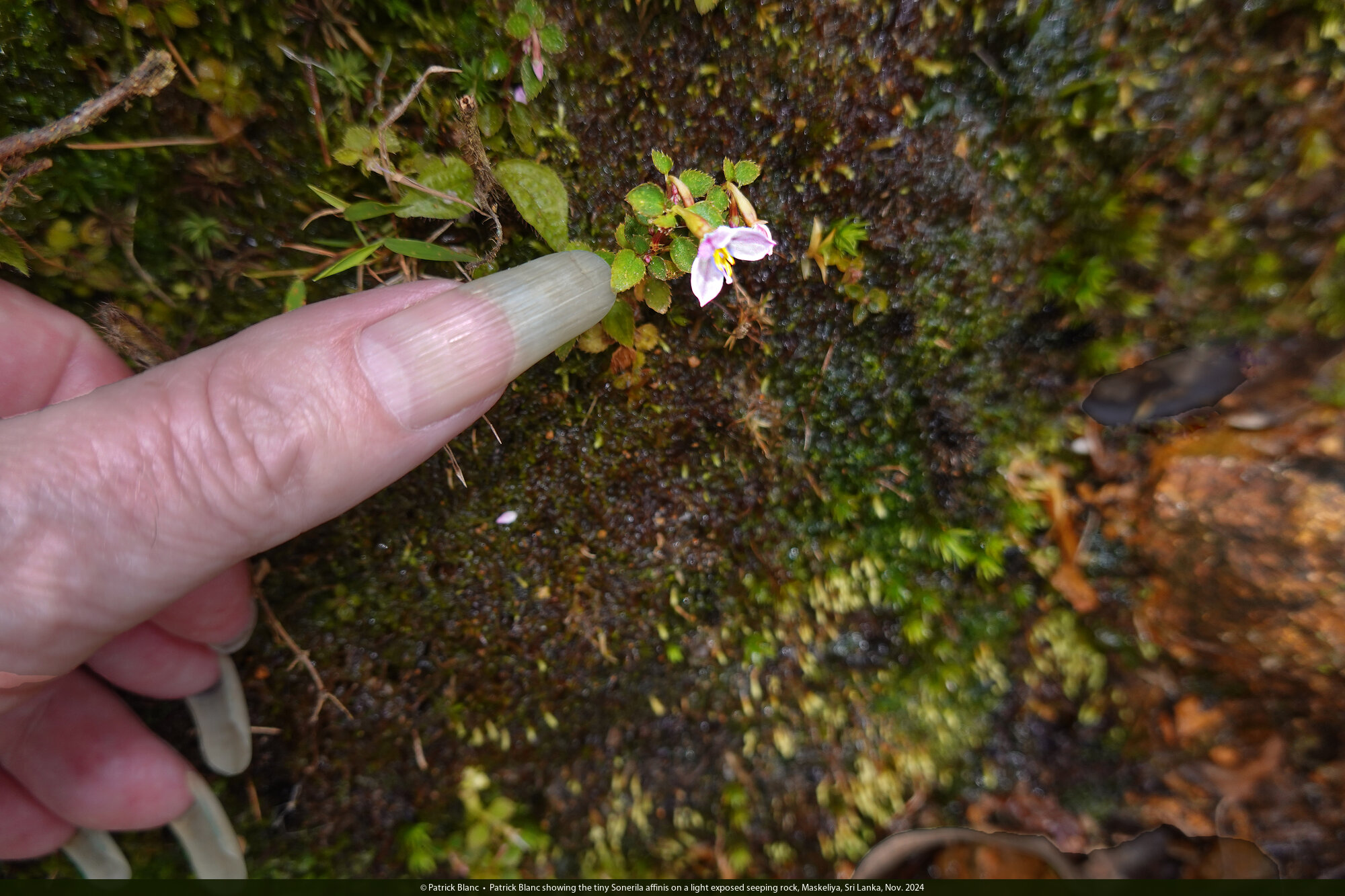 Patrick Blanc showing the tiny Sonerila affinis on a light exposed seeping rock, Maskeliya, Sri Lanka, Nov. 2024