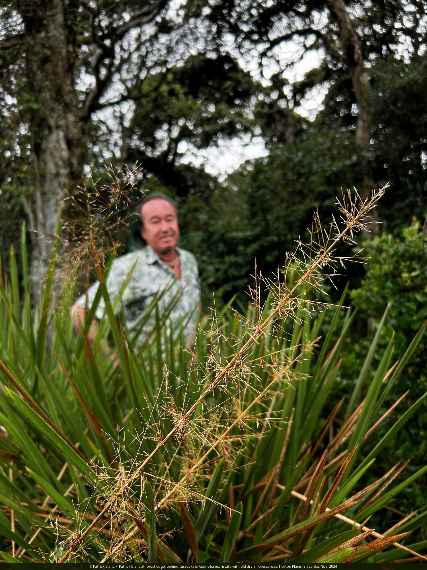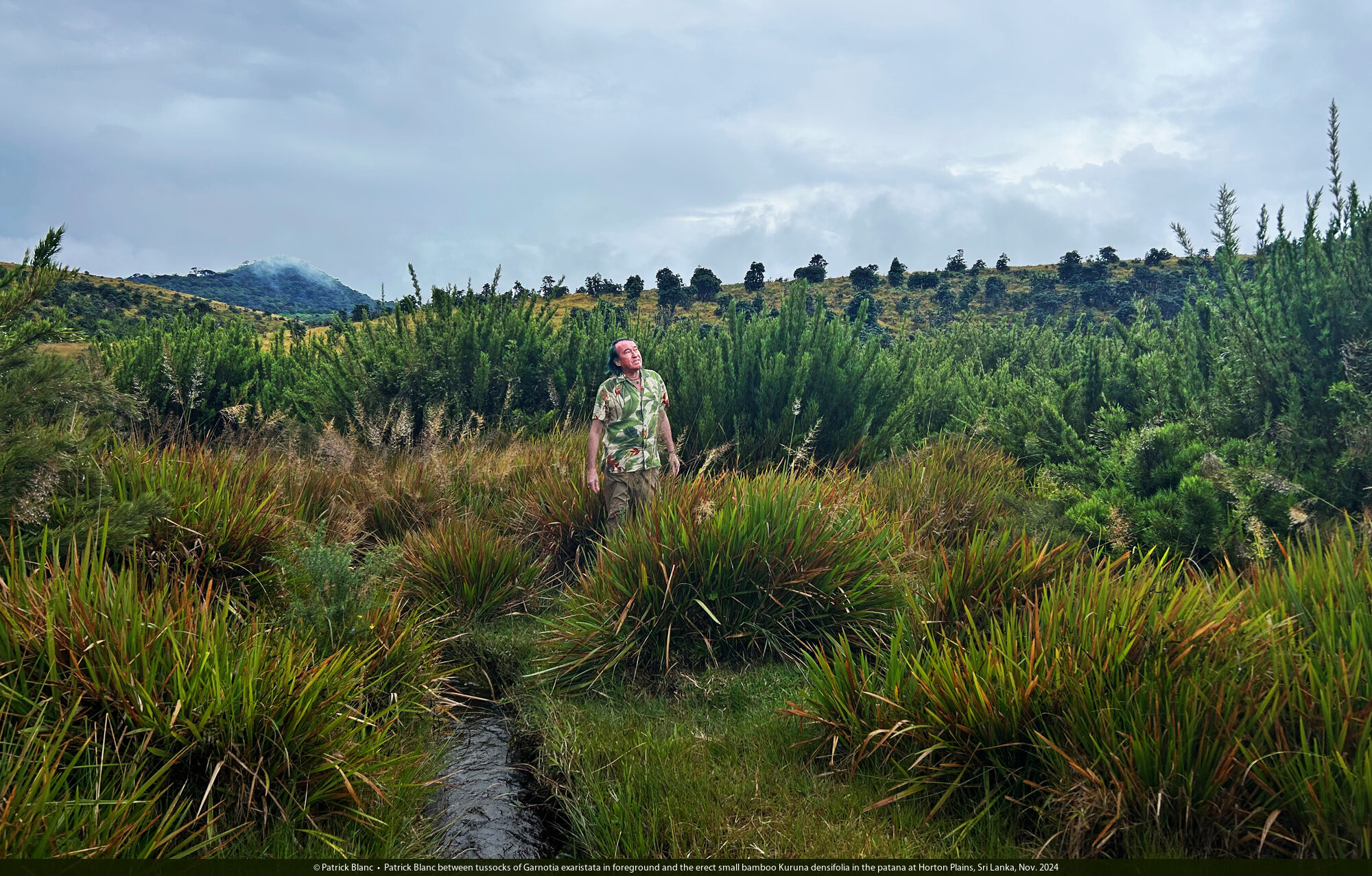 Patrick Blanc in patana, the water logged savanna, among flowering tussocks of Garnotia exaristata, Horton Plains, Sri Lanka, Nov. 2024