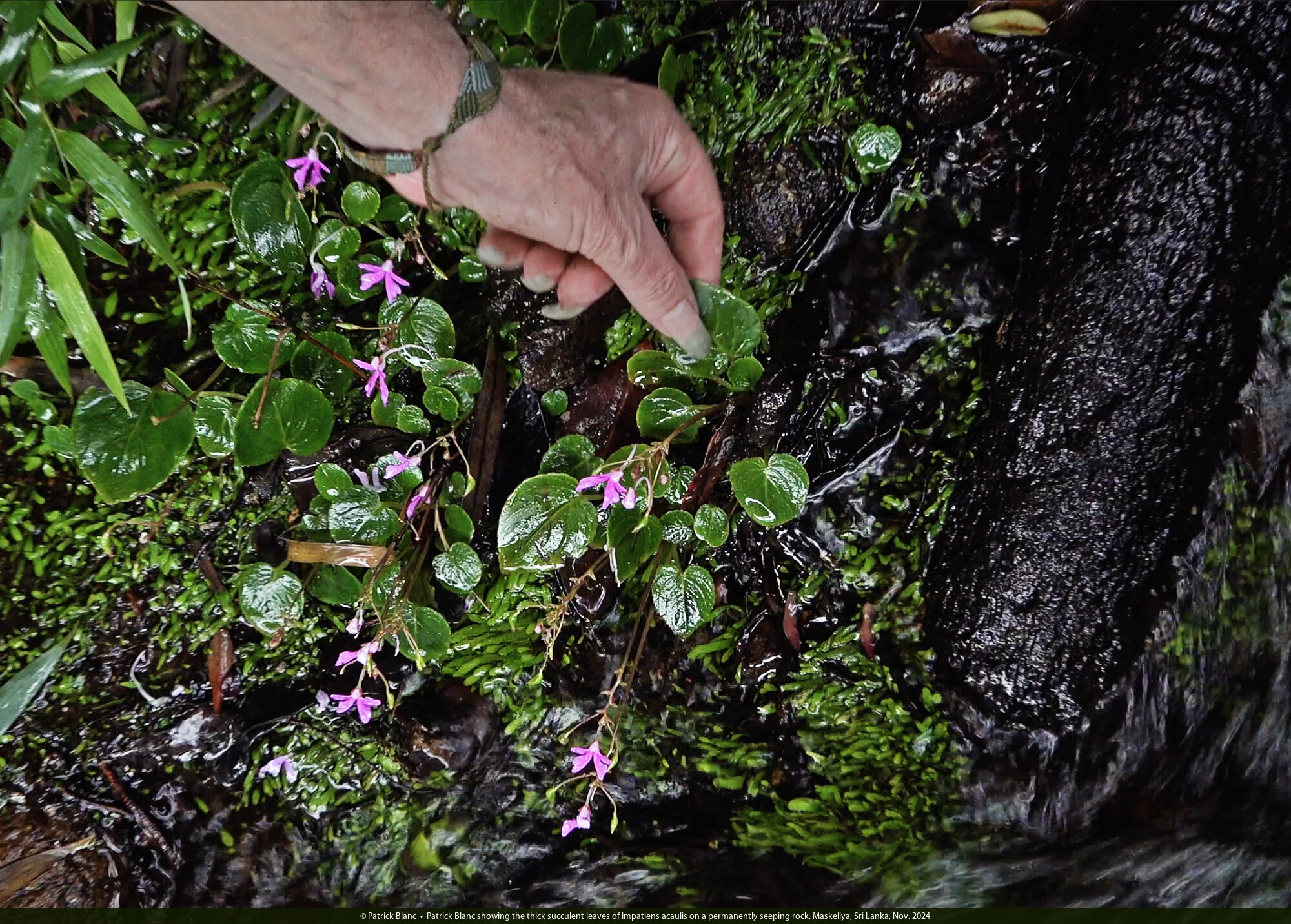 Patrick Blanc showing the thick succulent leaves of Impatiens acaulis on a permanently seeping rock, Maskeliya, Sri Lanka, Nov. 2024
