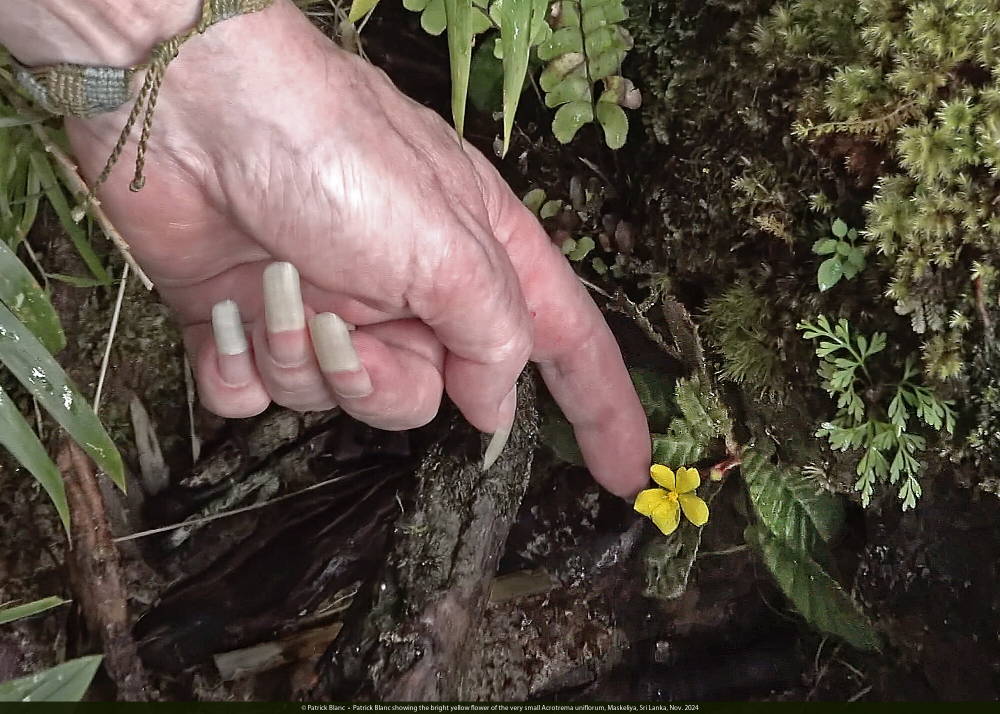 Patrick Blanc showing the bright yellow flower of the very small Acrotrema uniflorum, Maskeliya, Sri Lanka, Nov. 2024