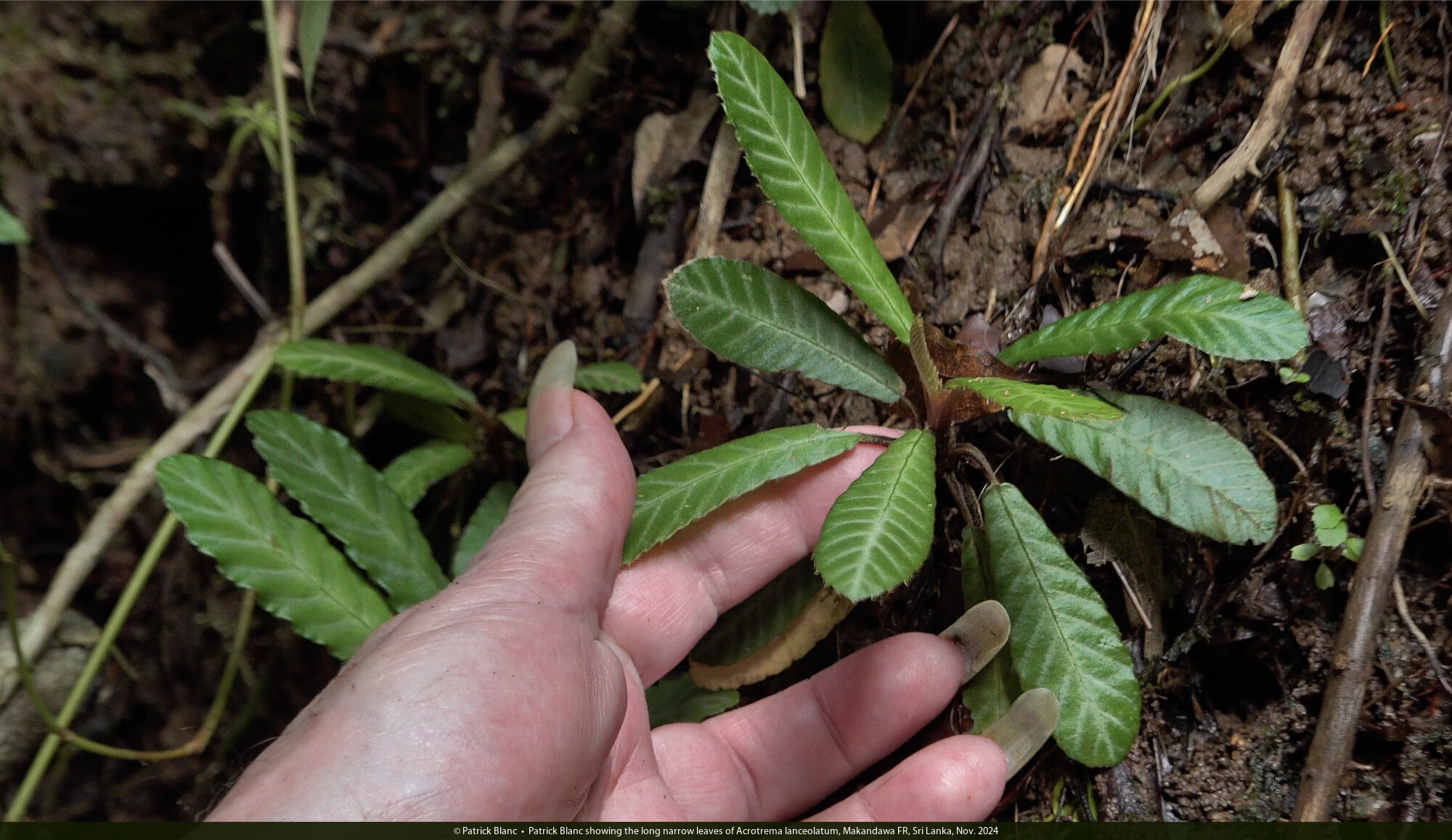 Patrick Blanc showing the long narrow leaves of Acrotrema lanceolatum, Makandawa FR, Sri Lanka, Nov. 2024