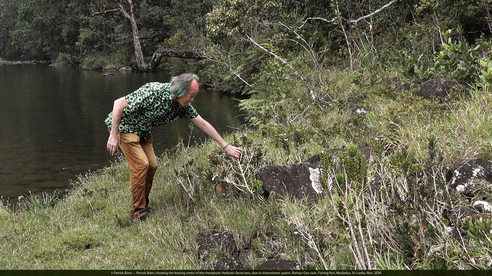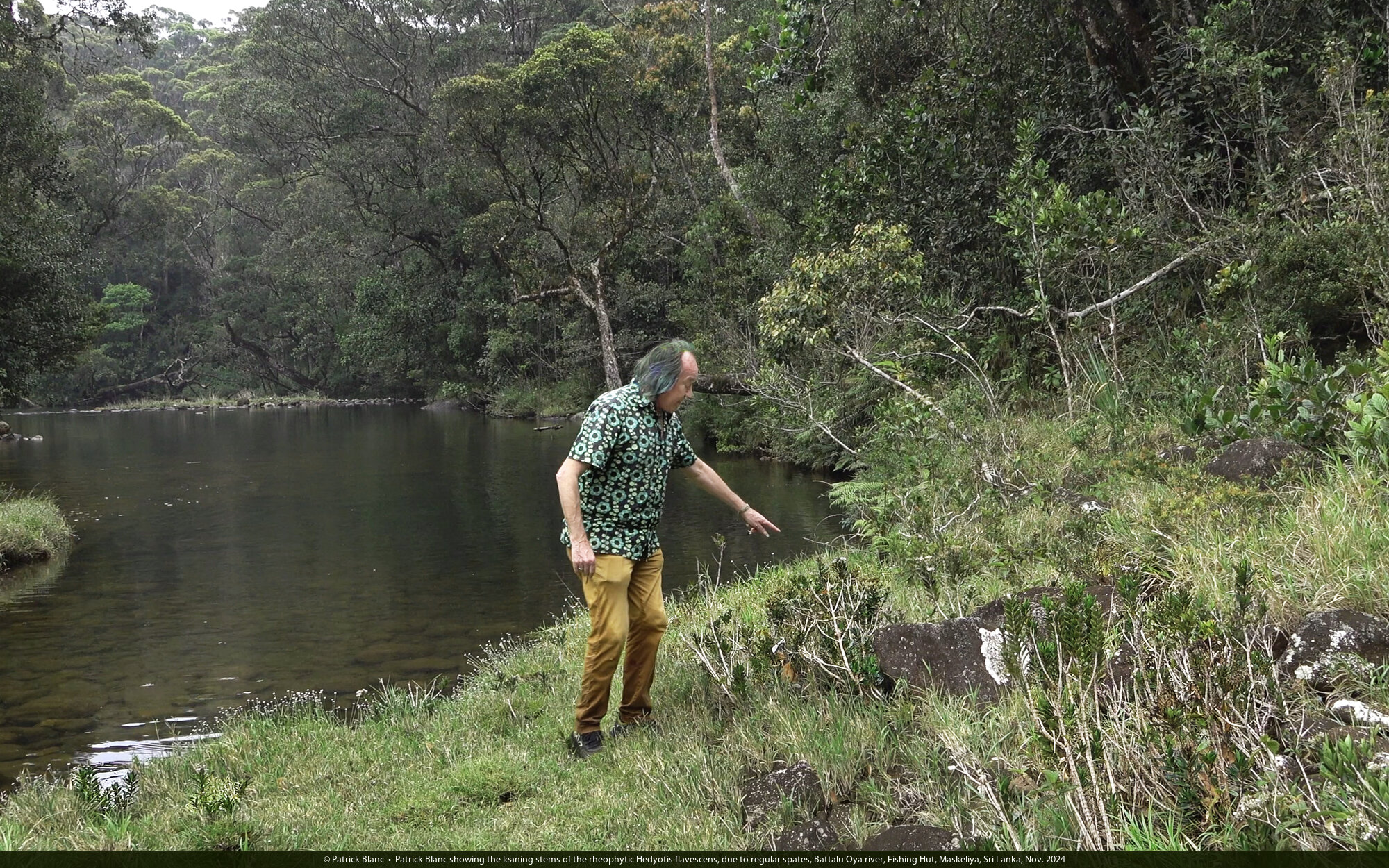 Patrick Blanc showing the leaning stems of the rheophytic Hedyotis flavescens, due to intermittent spates, Battalu Oya river, Fishing Hut, Maskeliya, Sri Lanka, Nov. 2024
