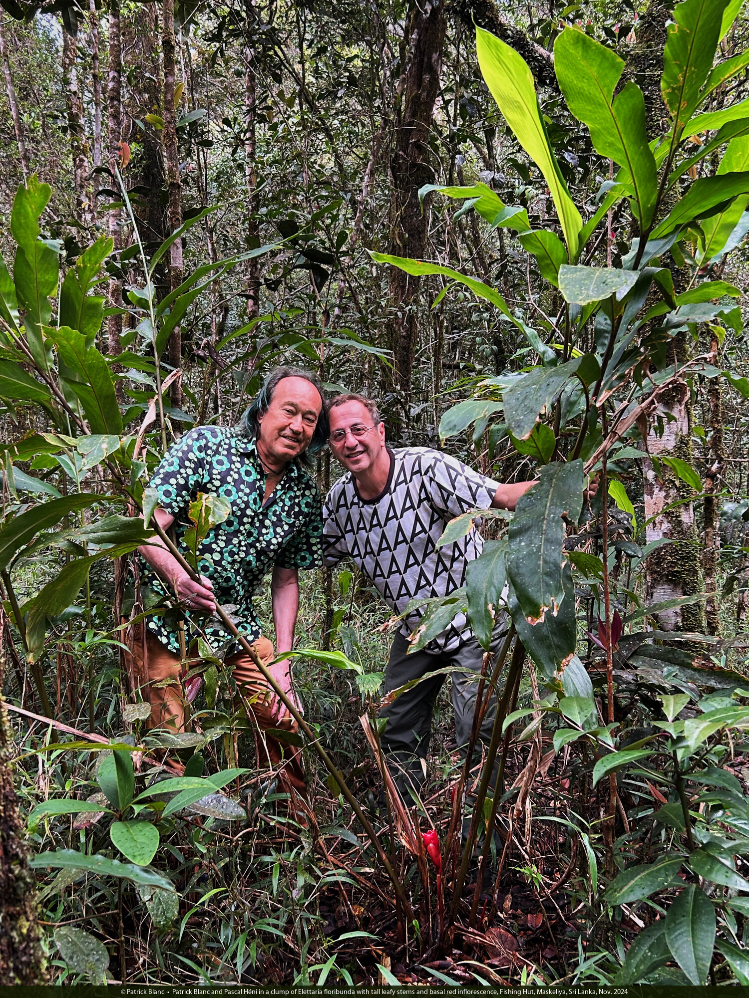 Patrick Blanc and Pascal Héni in a clump of Elettaria floribunda with tall leafy stems and basal red inflorescence, Fishing Hut, Maskeliya, Sri Lanka, Nov. 2024