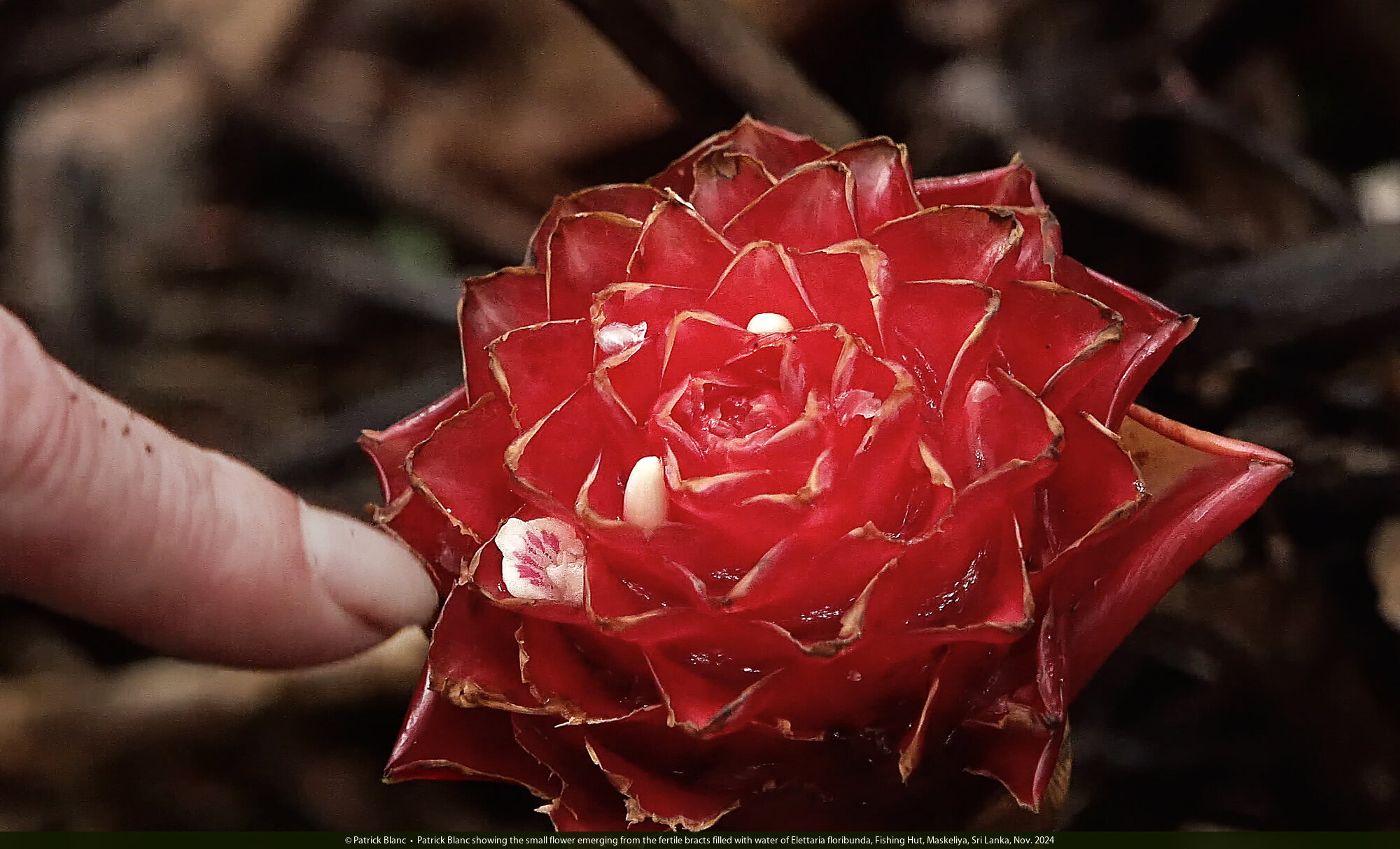 Patrick Blanc showing the small flower emerging from the fertile bracts filled with water of Elettaria floribunda, Fishing Hut, Maskeliya, Sri Lanka, Nov. 2024